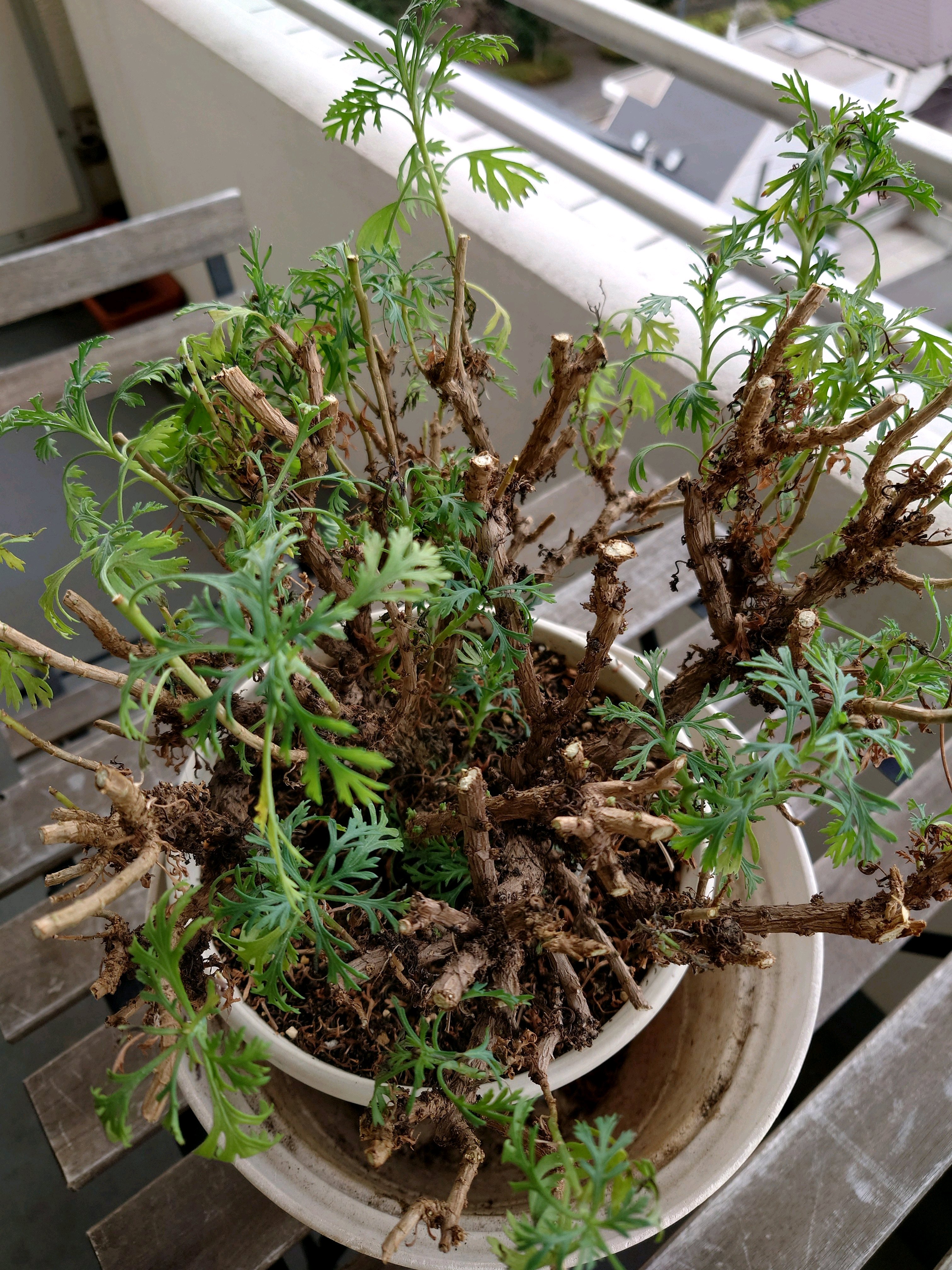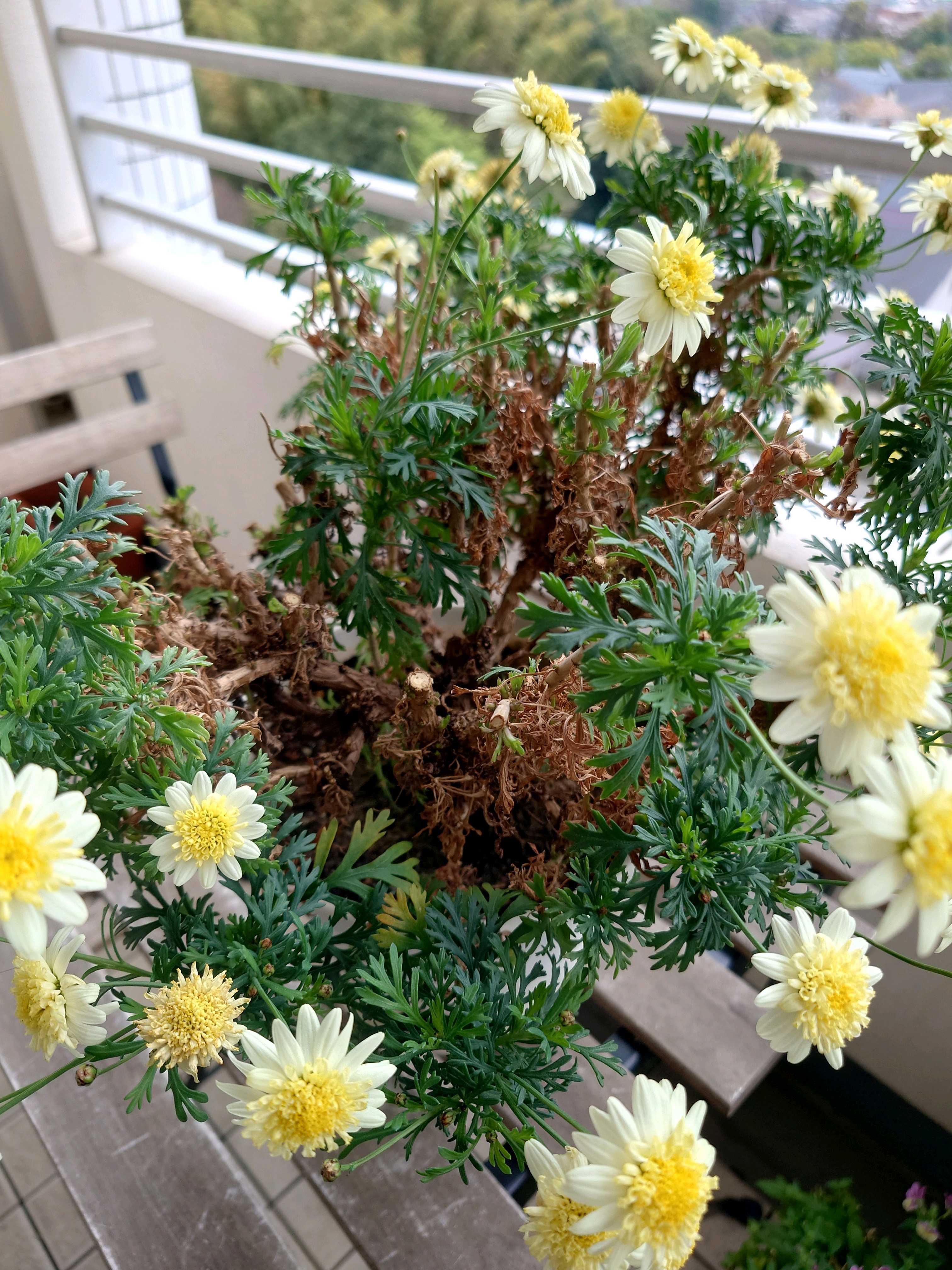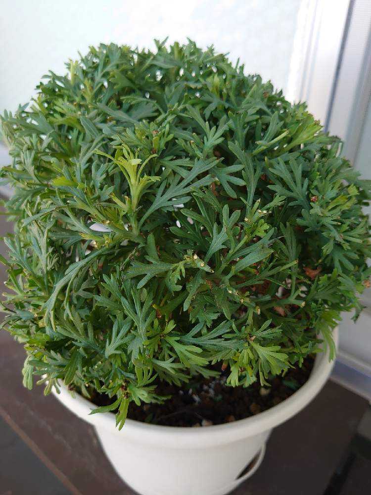 夏の暑さでボロボロになり、ギリギリまで切りました。そこから少しずつ大きくなり、今は直径40センチまでに成長しました。バランス悪く、倒れそうです。切り戻したときは、もうお花が咲かないのでは…と思っても1月には蕾をつけてくれます。氷点下の時だけ、夜に室内にいれています。