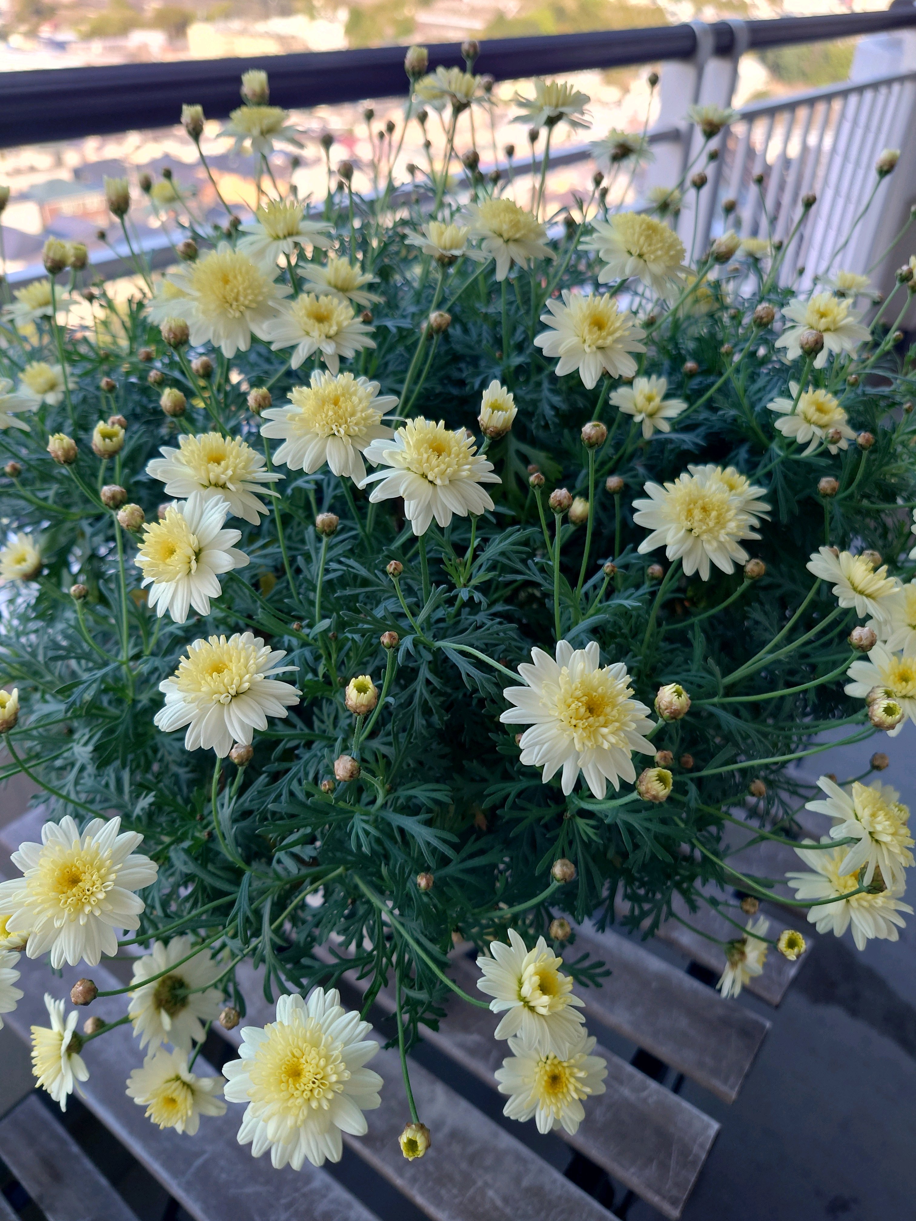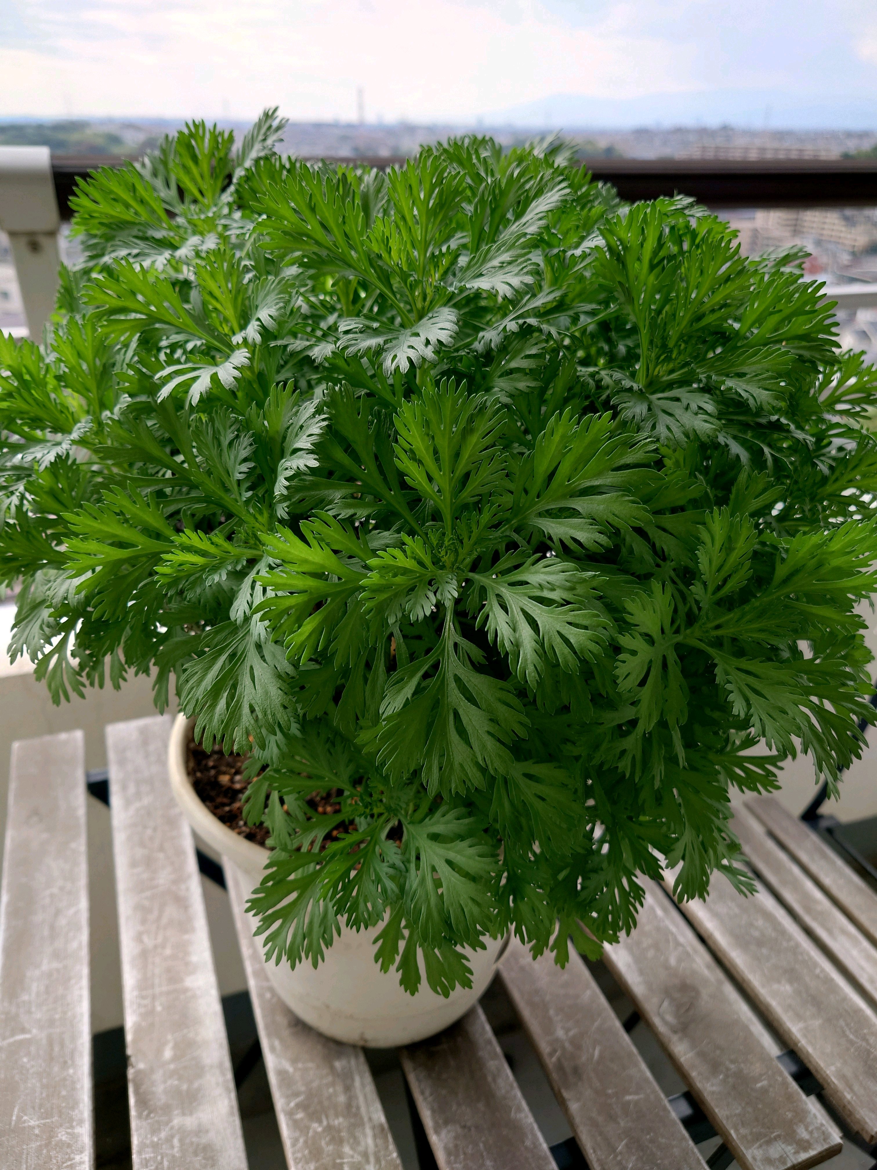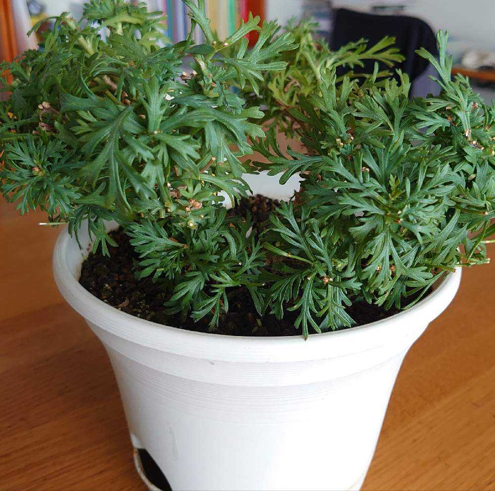 夏の暑さでボロボロになり、ギリギリまで切りました。そこから少しずつ大きくなり、今は直径40センチまでに成長しました。バランス悪く、倒れそうです。切り戻したときは、もうお花が咲かないのでは…と思っても1月には蕾をつけてくれます。氷点下の時だけ、夜に室内にいれています。