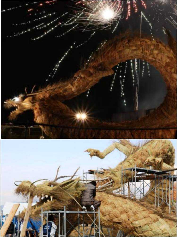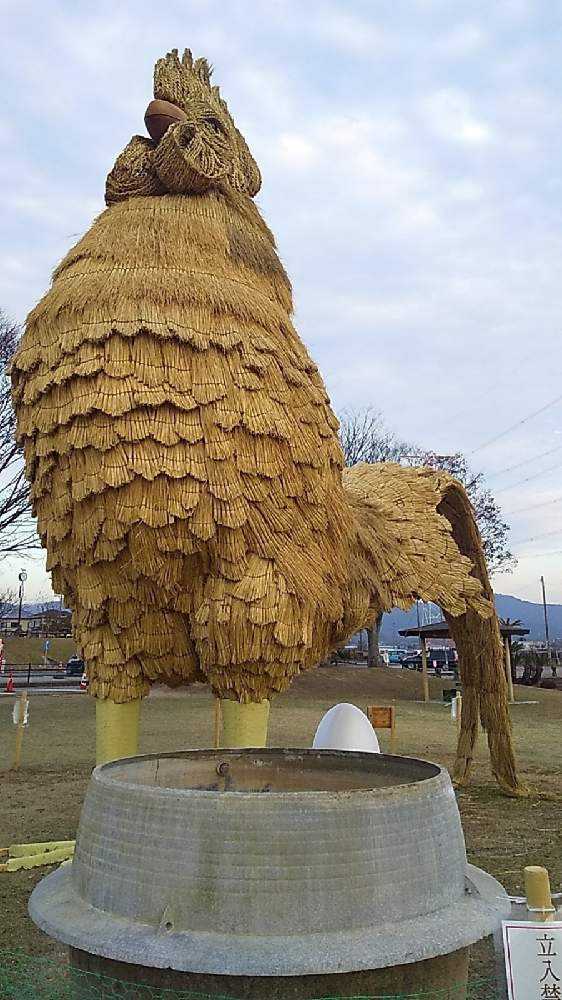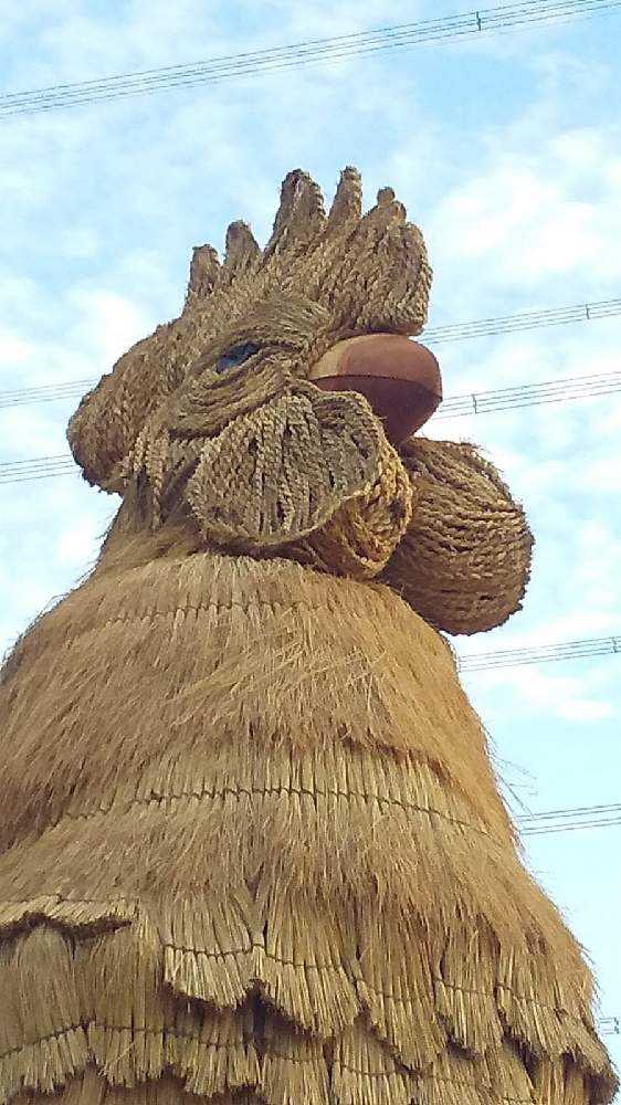 角材や竹、鉄骨で作った骨組みに「とば編み」と呼ばれる編み込みのわらで肉付けしたみごとなわらかがしです。
