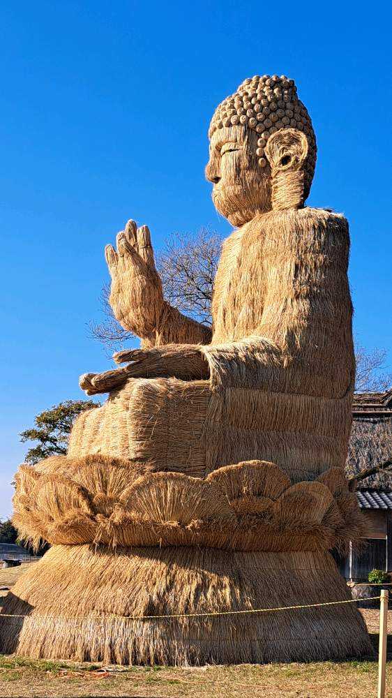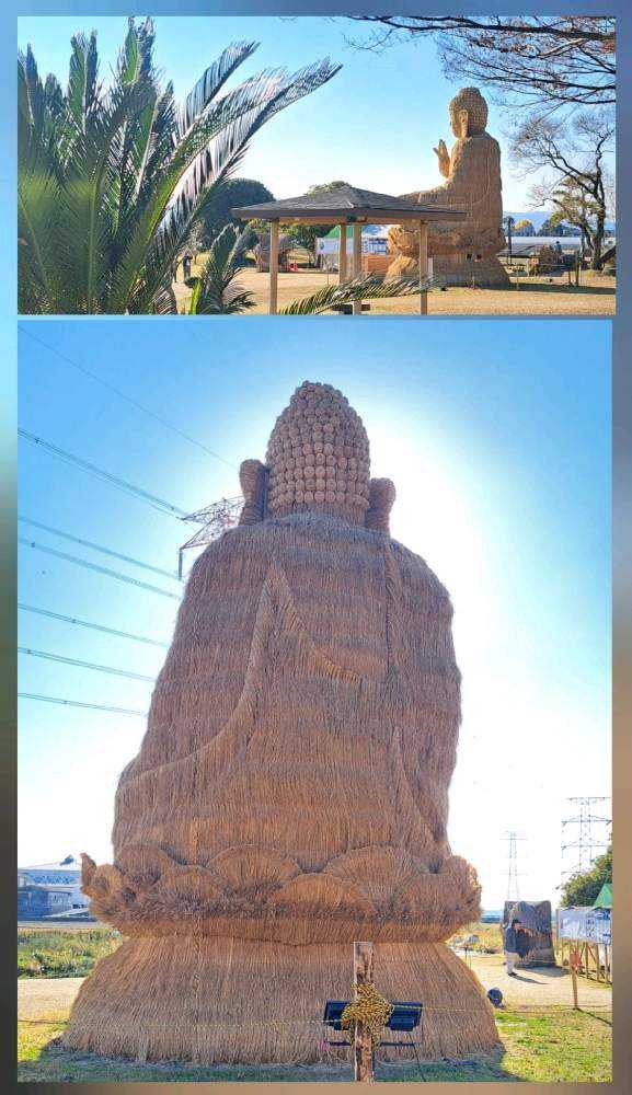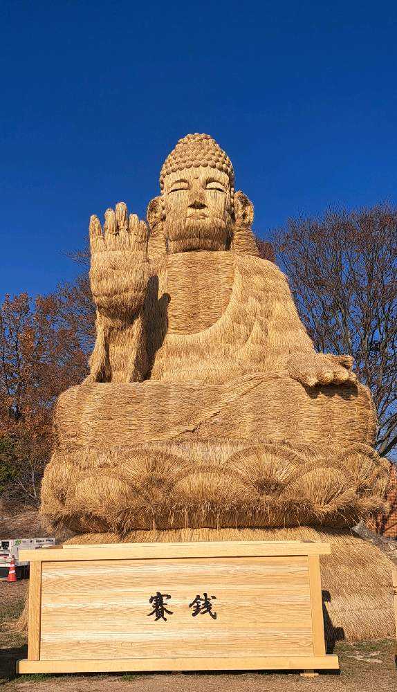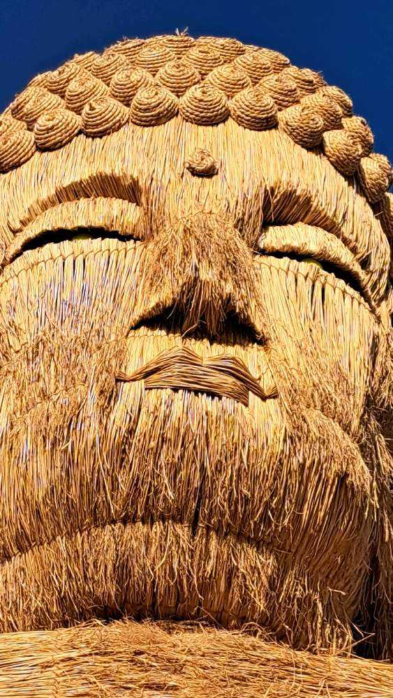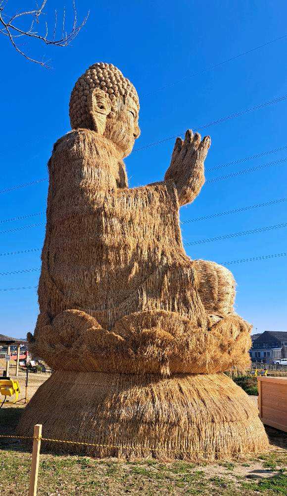 近くで見て迫力を感じ、平和な世界をお願いして欲しいと感染症や自然災害、平和を願い制作された「わらの大仏」です。