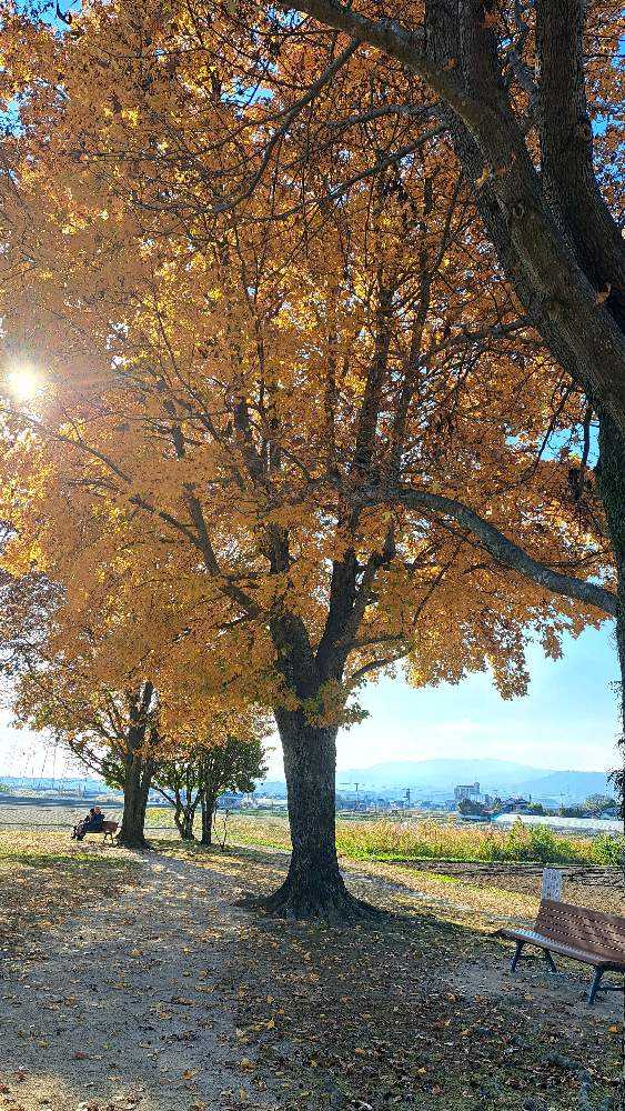 紅葉した木の下のベンチで高齢のご夫婦が肩を寄せあって語らっていられました.。.:*♡ (˘͈ᵕ ˘͈ ও)ஐ*🤍