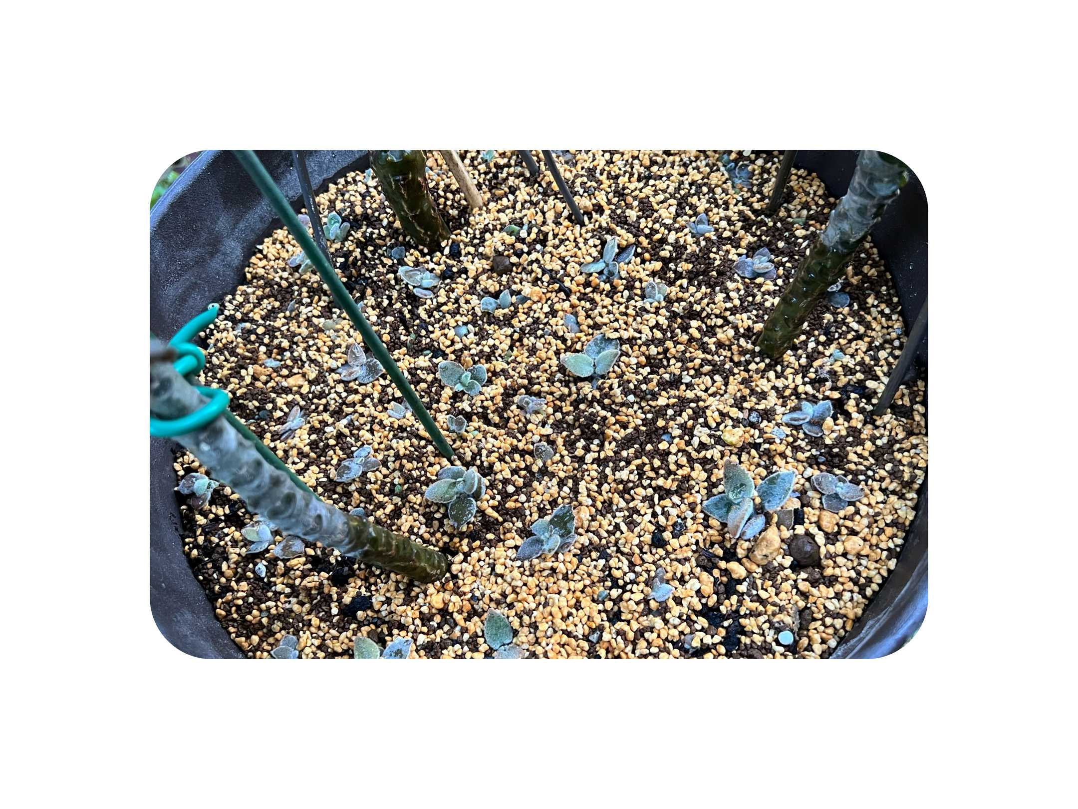 どうやってこんなに赤ちゃんが出たのか、どの様に増えているのか、謎でしたが、掘り返してみても、よくわかりませんでした。根っこから…❓❓表面から1センチくらいの土の表面に張った根っこから出ている感じでした。花も咲いていませんでしたし…。
