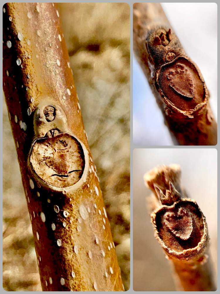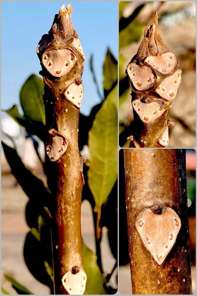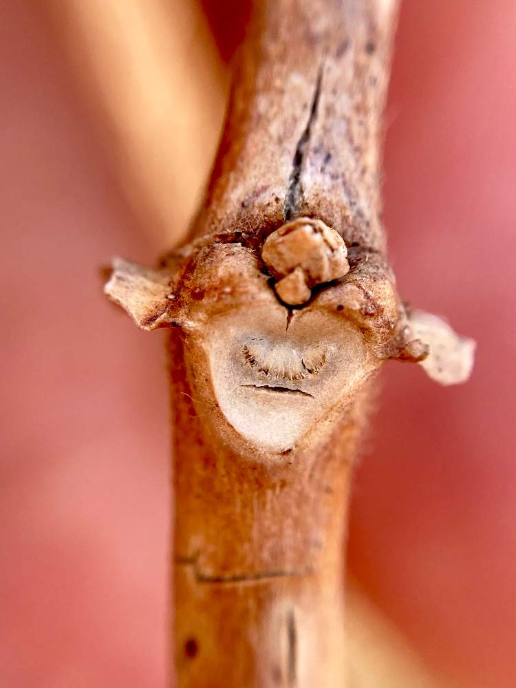 葉痕は楕円形。維管束痕はやや不明瞭ですが、嬉しそうに笑ったボーヤのよう❣️