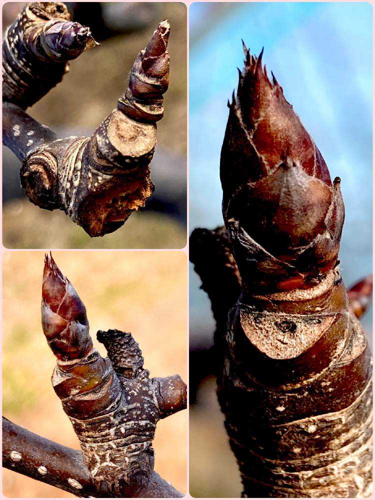 葉痕より大きめの茶色の帽子をつけて冬を乗り越えます♪