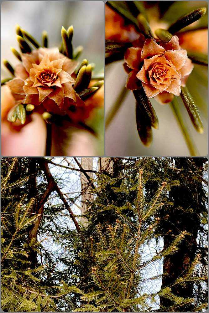ドイツトウヒと同じようにバラのように見えるのは冬芽の芽鱗が開いたもので、この真ん中から緑の新芽が出てきます♪