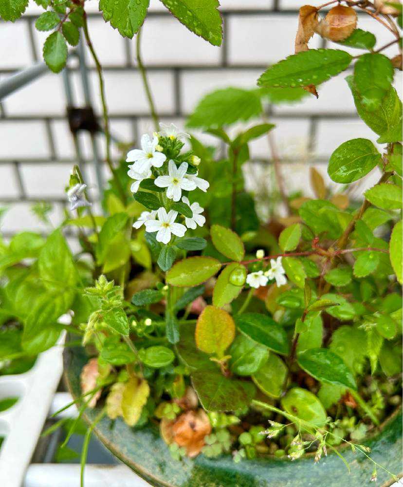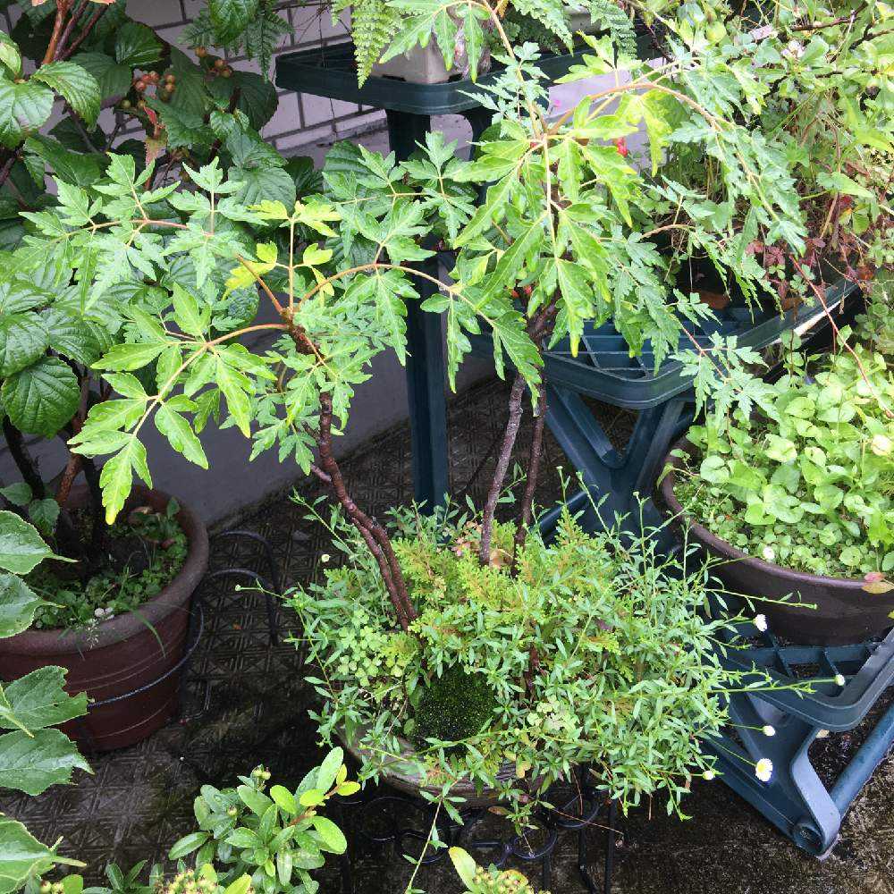 葉の形🌴がユニークなこの子は名前が分かりません。発芽5年くらい経っていると思います。いい感じに草物盆栽ふうに成長しています。下生えはペラペラヨメナで切り戻すと春から秋まで花🌸がつきます