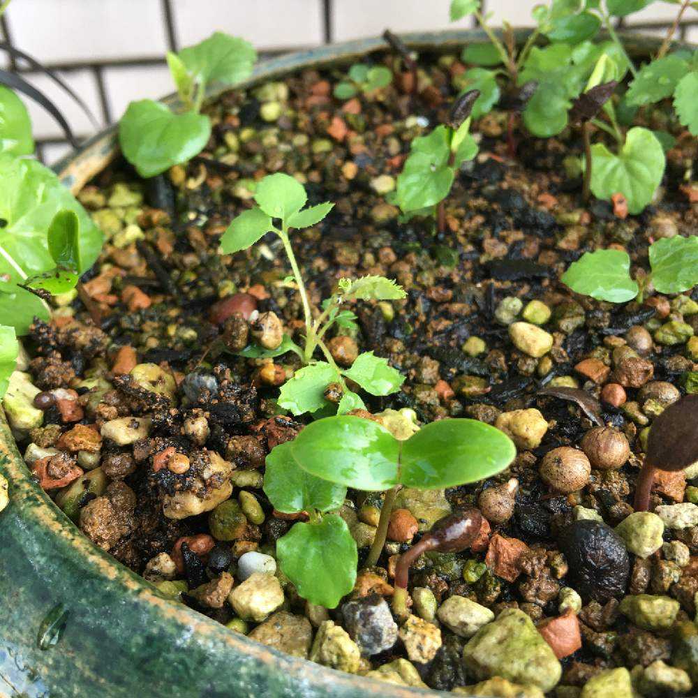 2023年04月15日、イワカラクサが咲きました。小鳥さんの💩ではなく種が爆ぜて混じったのかな。草の芽はまる1年、それなりにしっかりしたかな