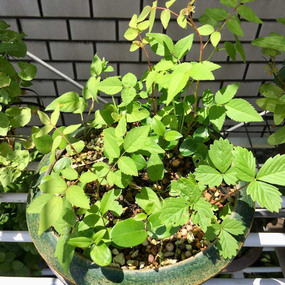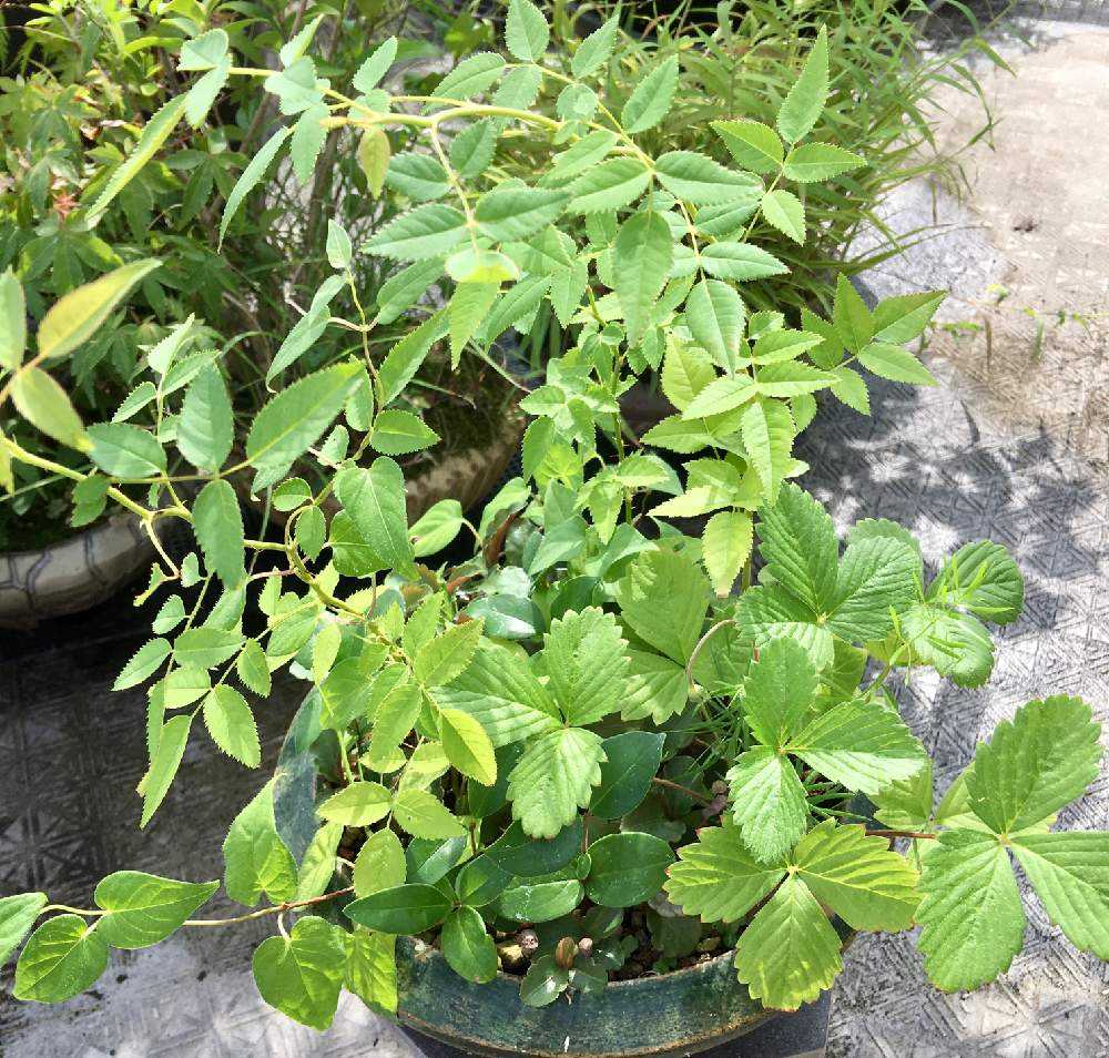 08月15日、日除け下から🪴出してみます。まだわからない子が多いけど、わかる子もいます。マンリョウ、ネズミモチ、へクソカズラ、イワカラクサ。棘があるのはツルバラの仲間?、ギザギザ三葉はイチゴの仲間?