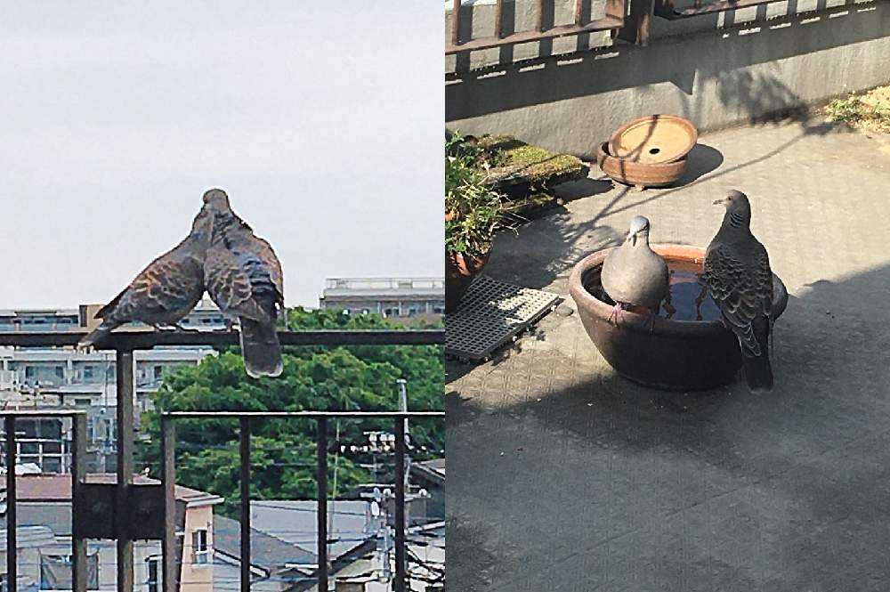 2022年05月、キジバトはニコイチ🕊🕊行動が基本です。しかしこやつらイチャイチャし過ぎです。小庭で営巣用の小枝を物色していました。