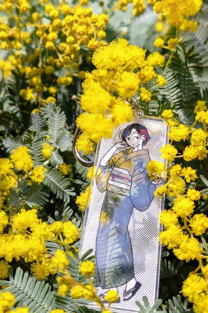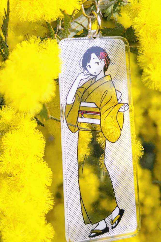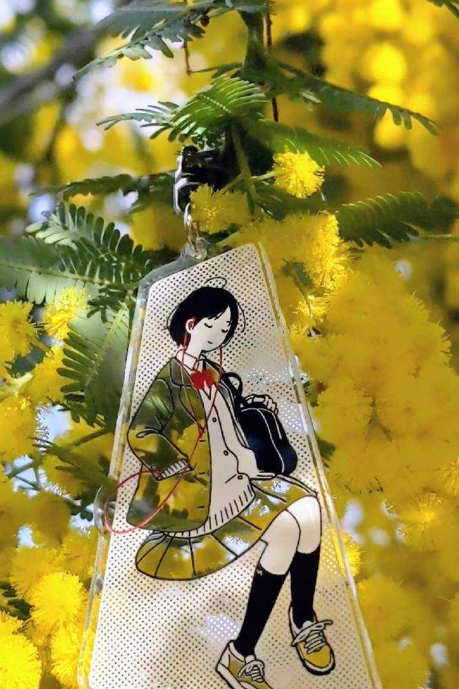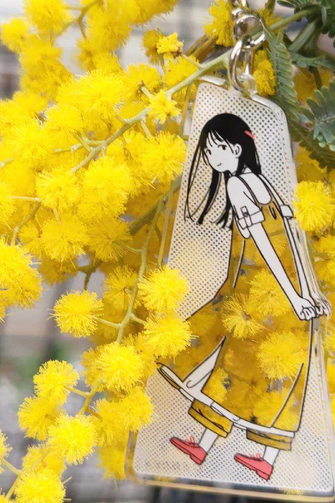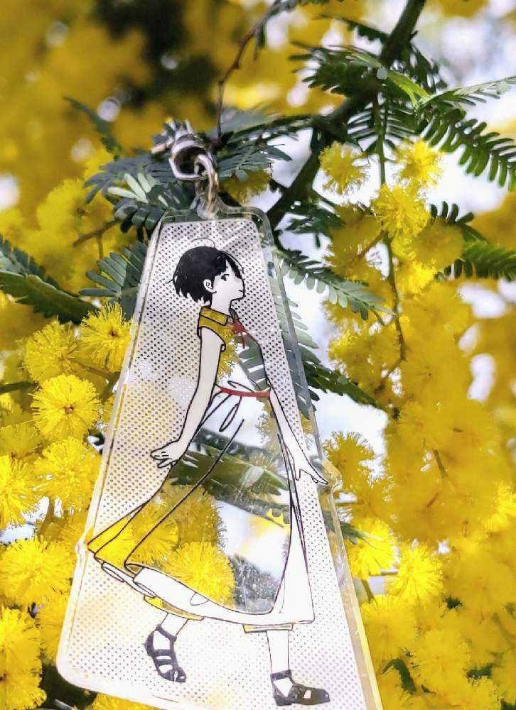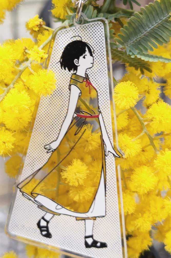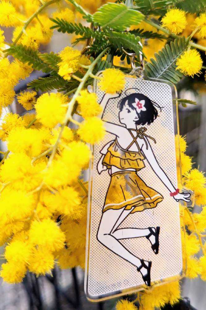 “お散歩は季節をまとって”冬野カモメさん作出アクリルキーホルダーで、ファッションショーをたのしんでます。着せ替えは無限大です。春を運ぶ黄色い花をまとわせた。幸せの黄色いリボン🎀。