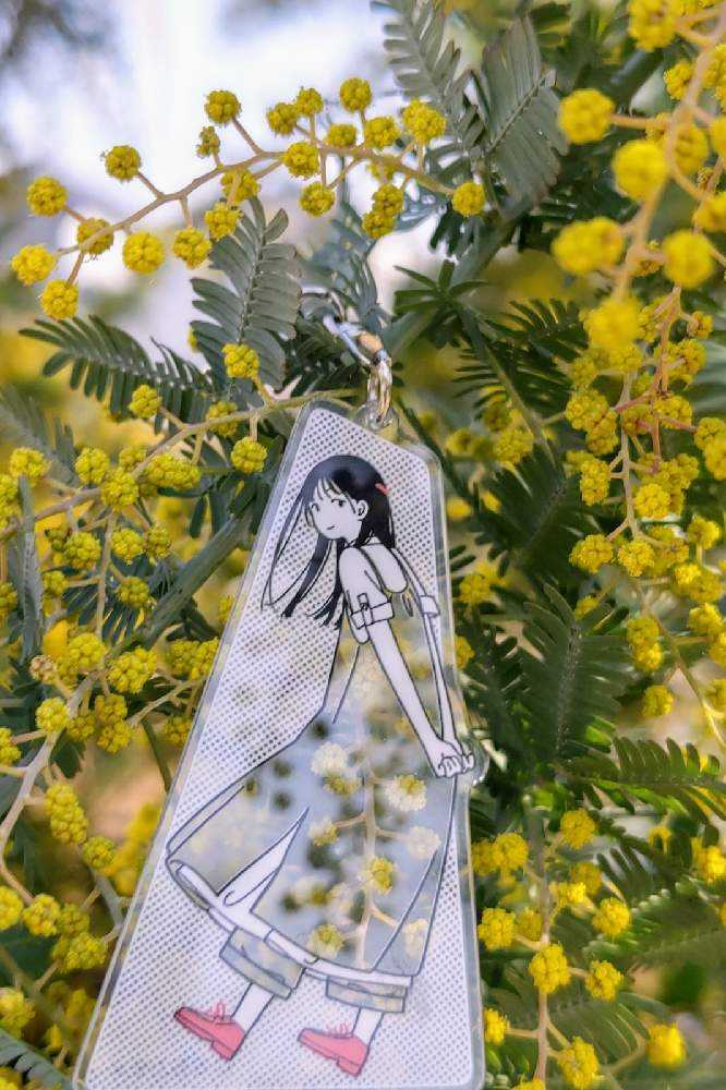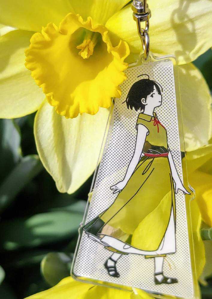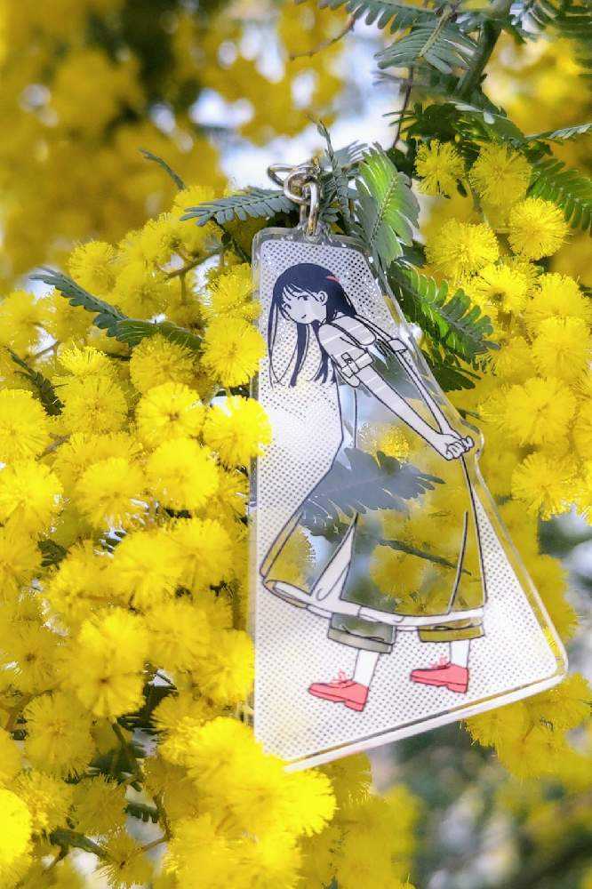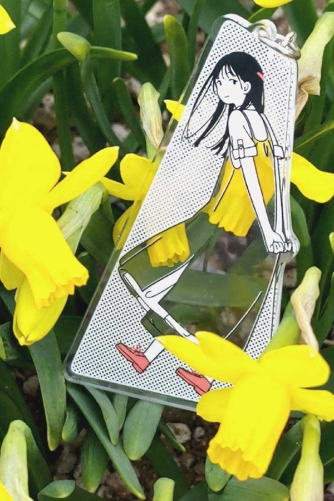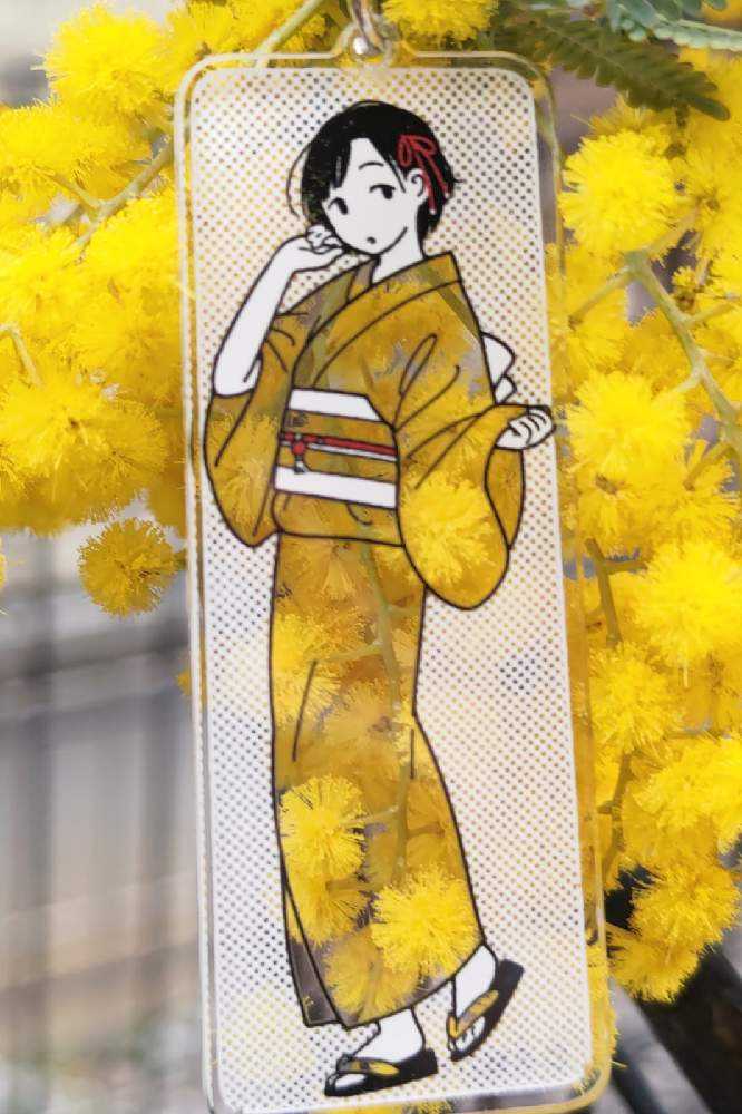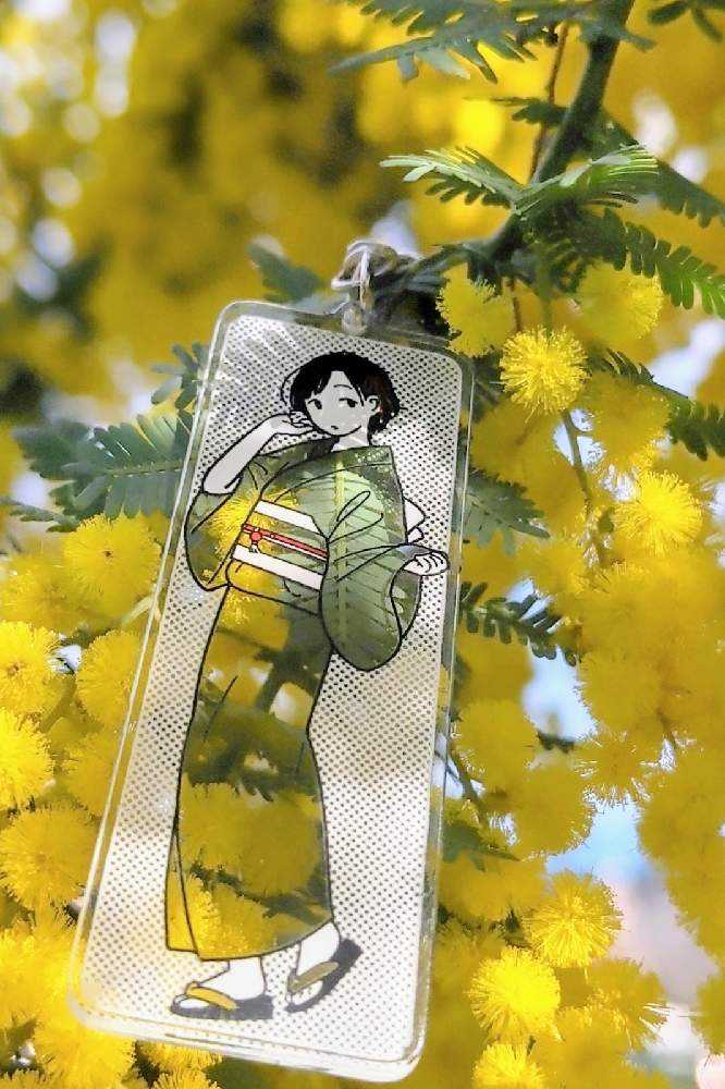 “お散歩は季節をまとって”冬野カモメさん作出アクリルキーホルダーで、ファッションショーをたのしんでます。着せ替えは無限大です。春を運ぶ黄色い花をまとわせた。幸せの黄色いリボン🎀。