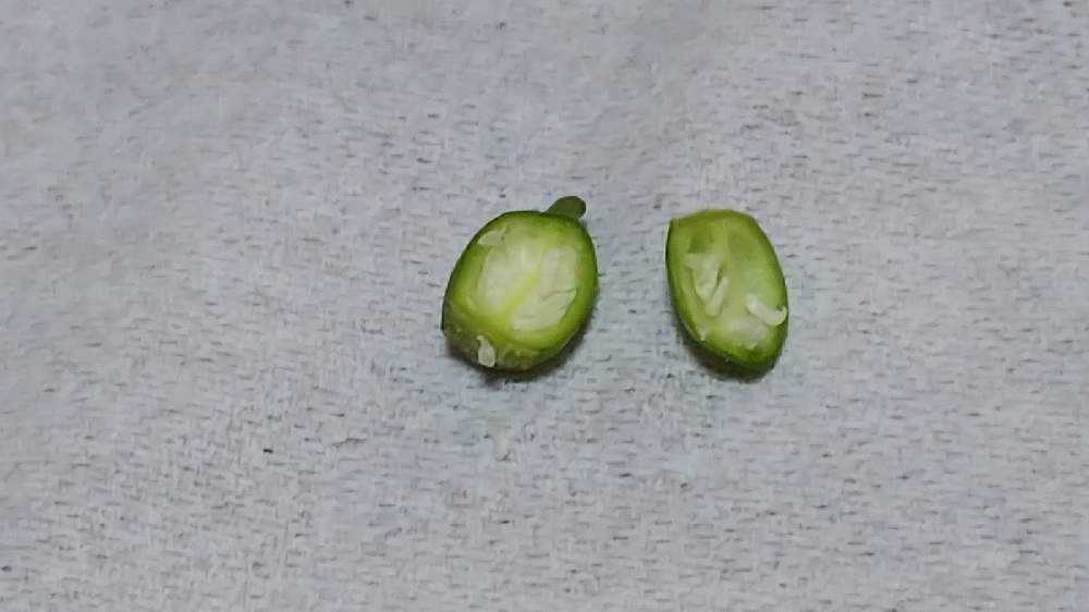 カッターで一個、割ってみました。サイトで種取りした方の情報を見ると、人工交配させて、更に実が黄変するまで待ってから実を割り、中から細長い沢山の種を取り出し、植えたようです。