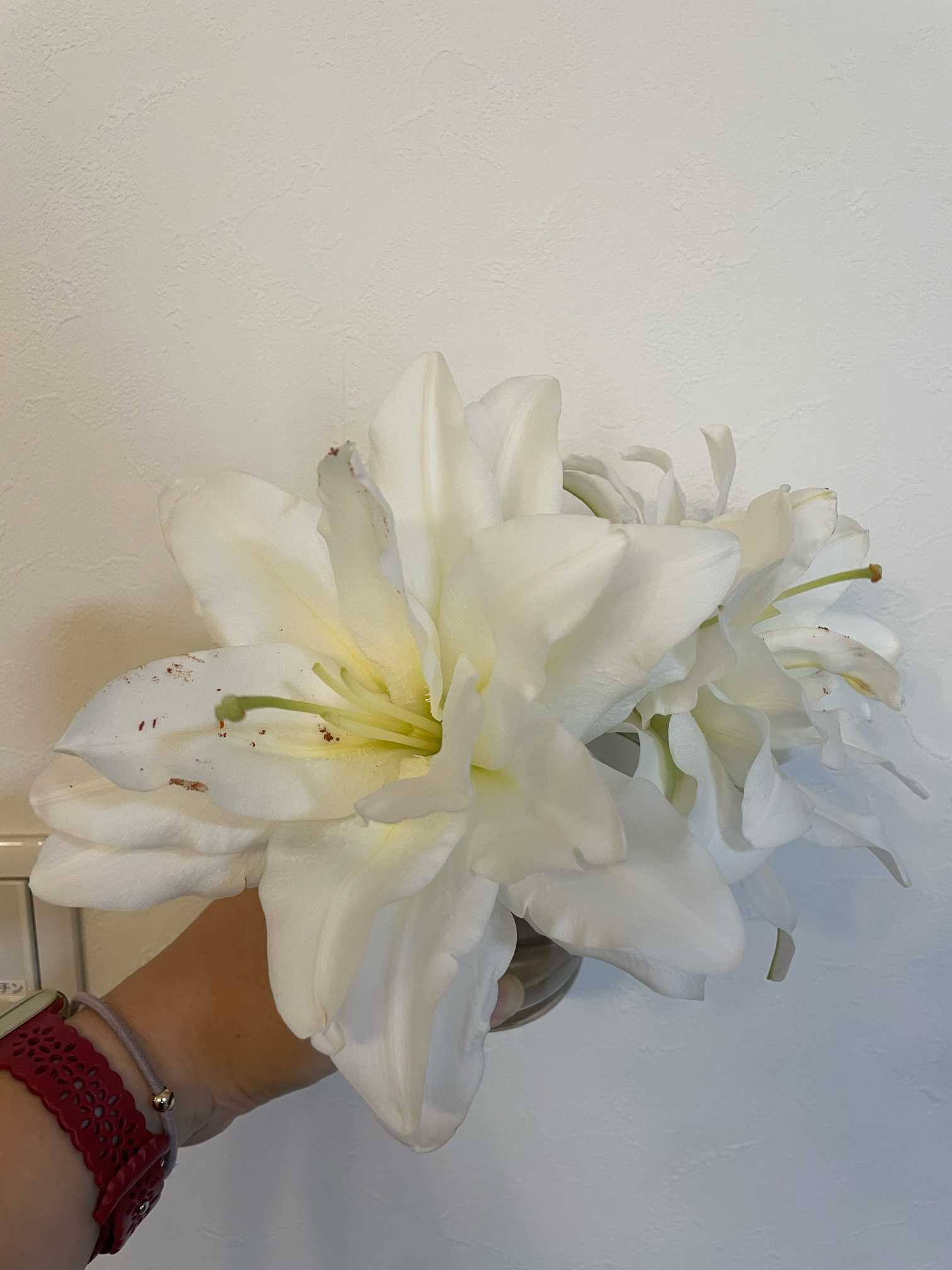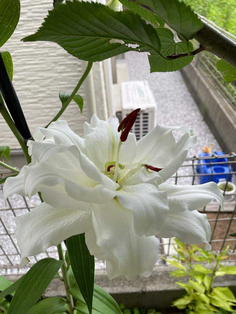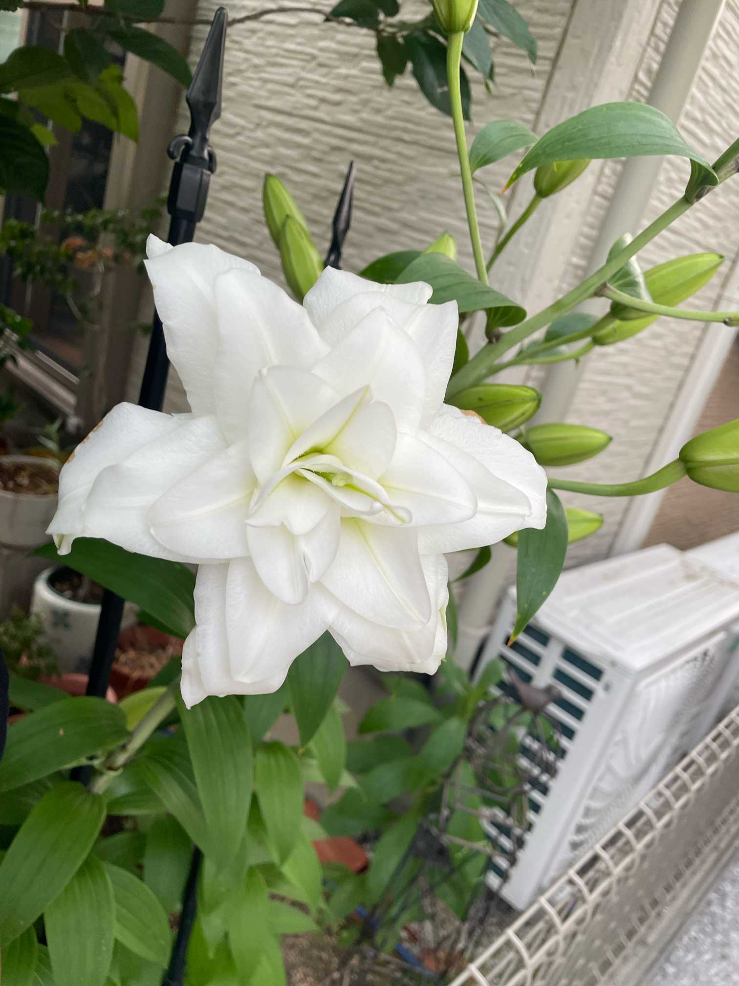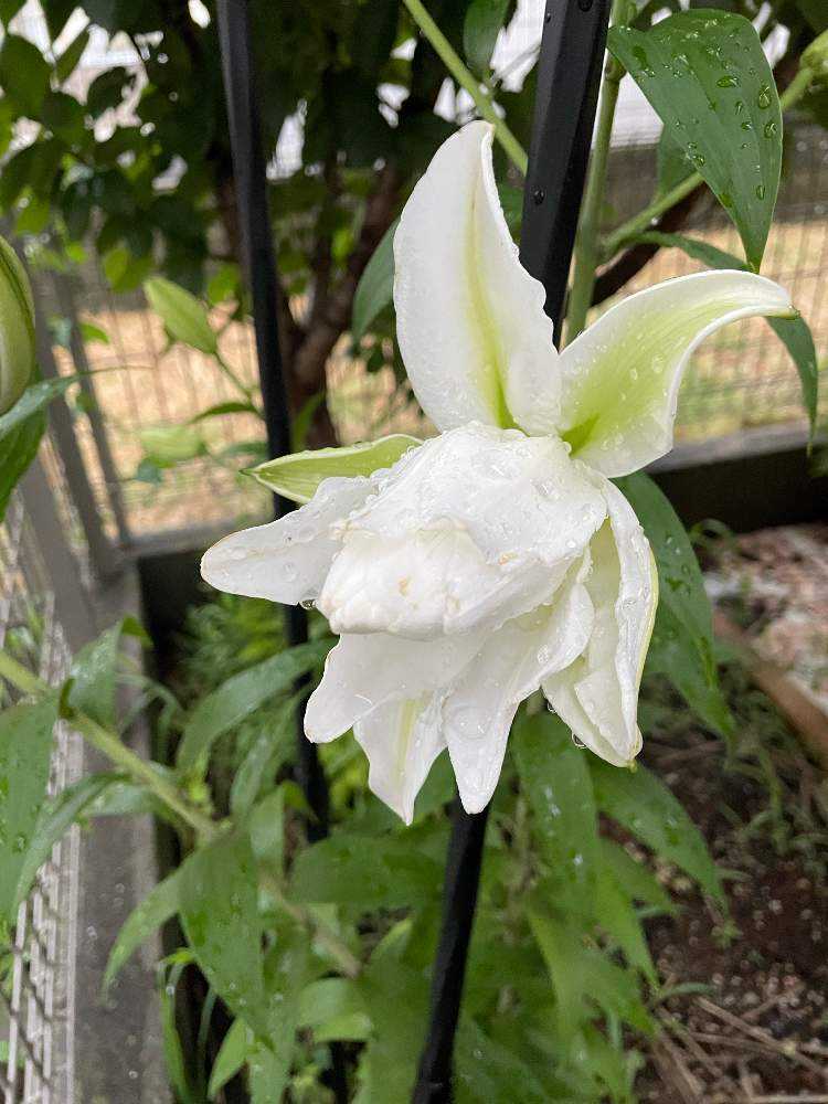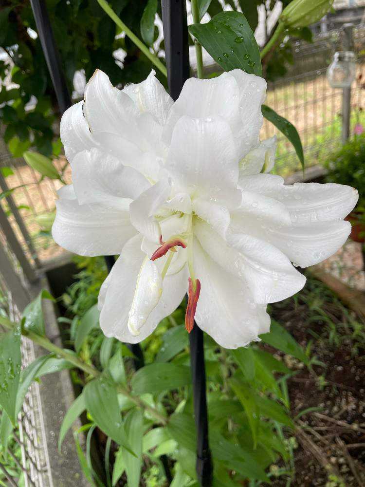 雨が上がった瞬間に撮影。このユリ、アヌースカと名前がついて販売されていたけど、なんか違う気がする。白し、何より、真ん中に雄蕊がある・・・あなたの名前はなんだろな?ダブルカサブランカ?