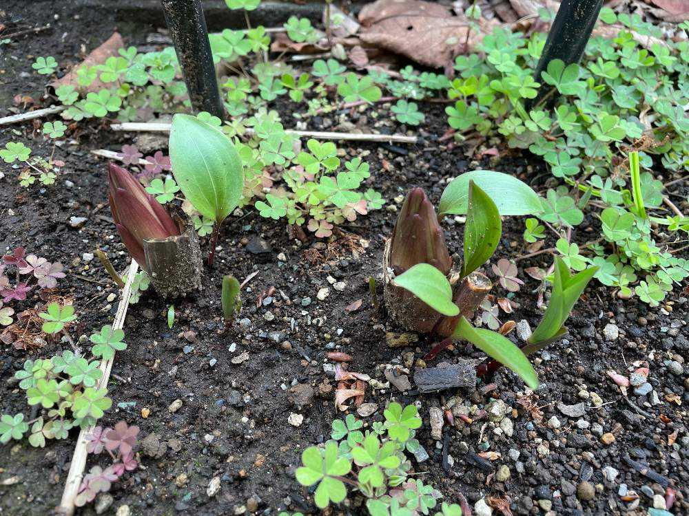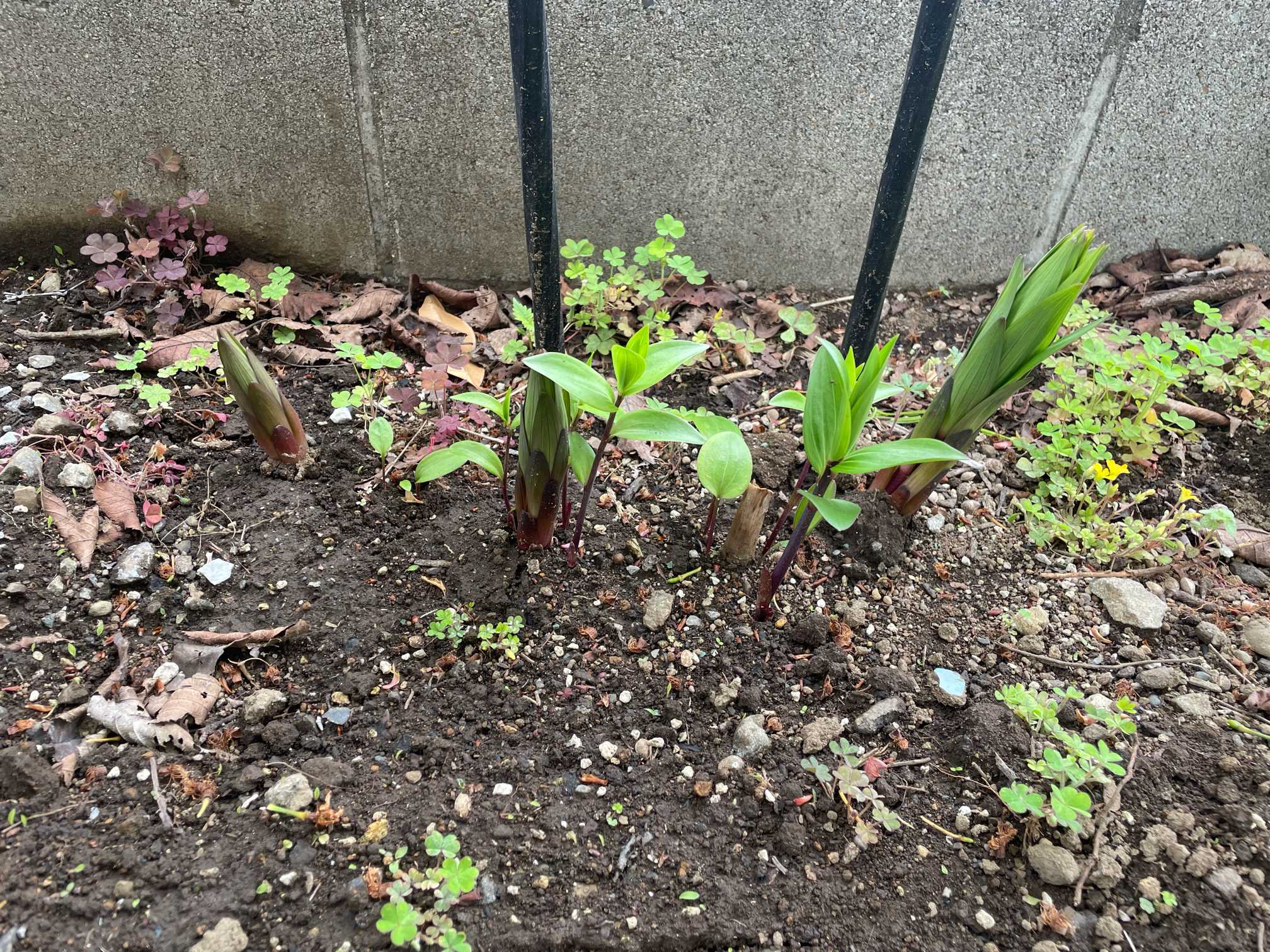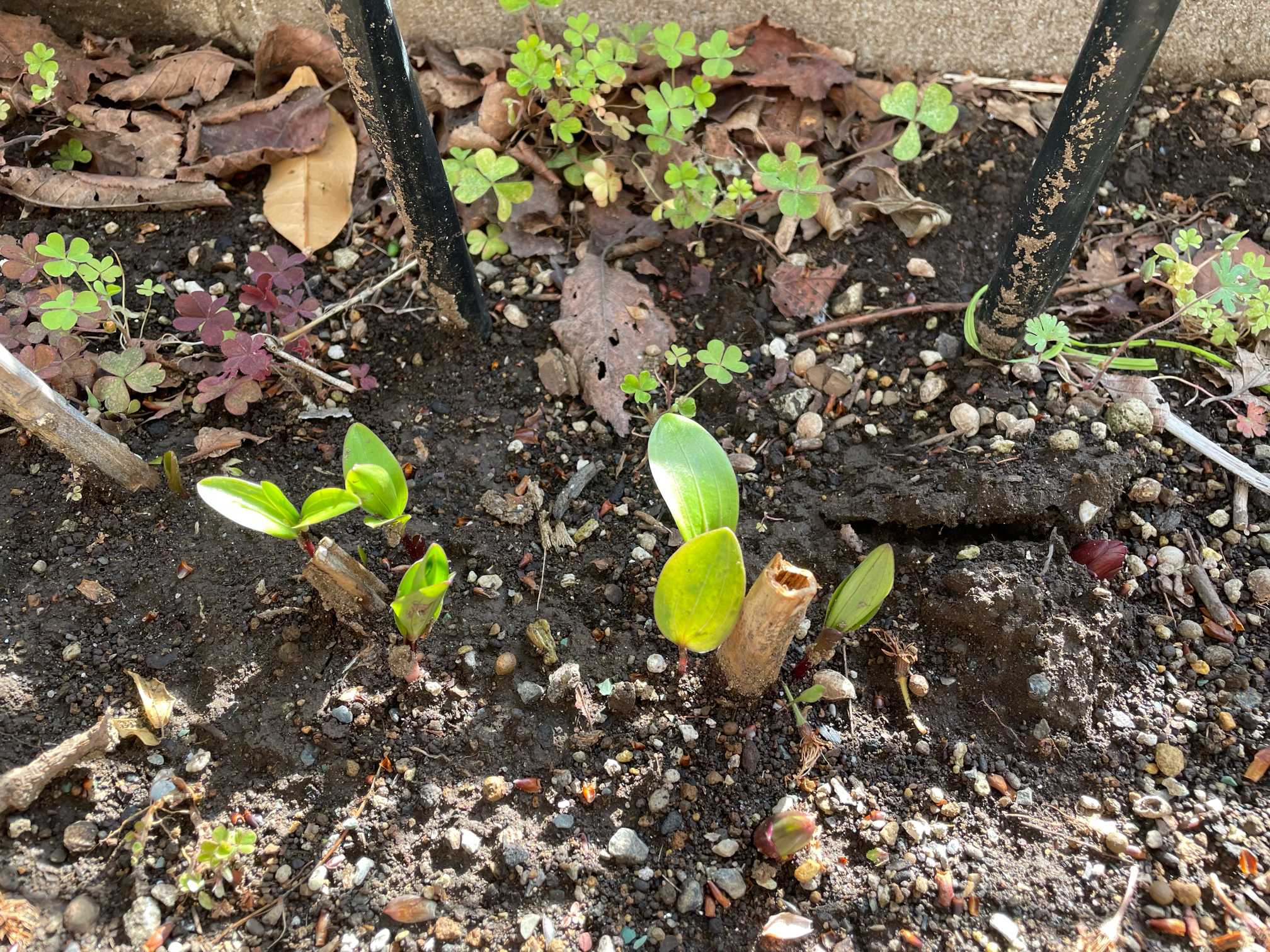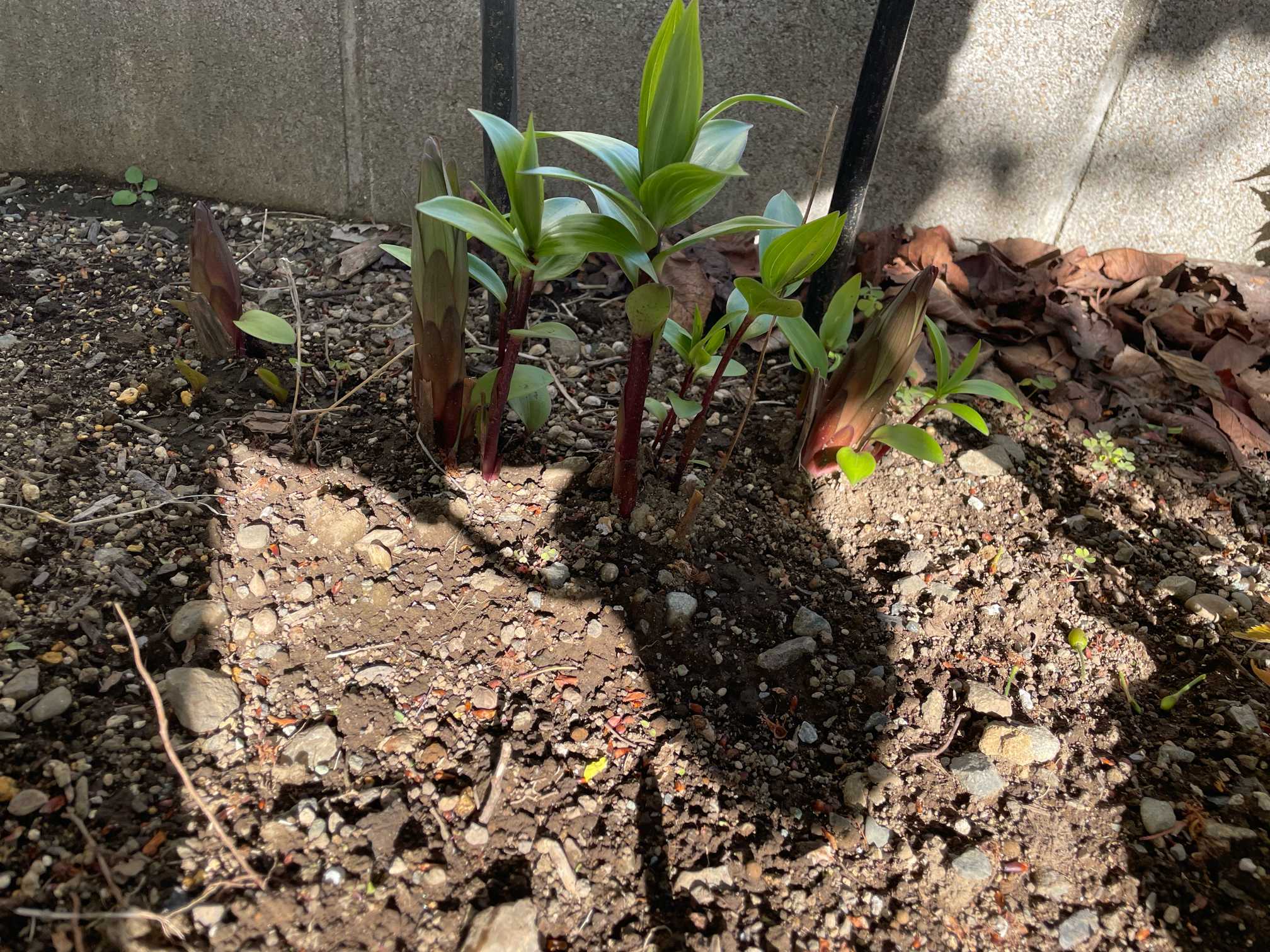 一週間くらい前に昨年で為の横や周りに小さな葉が出始めていた。これは百合なのかなぁと成長を見ていたらどうやら百合の芽らしい。右側に先端が赤い太い芽も今日発見。小さいのは分球したのかな?来年以降咲くようにこのままとらずに育ててみよう。