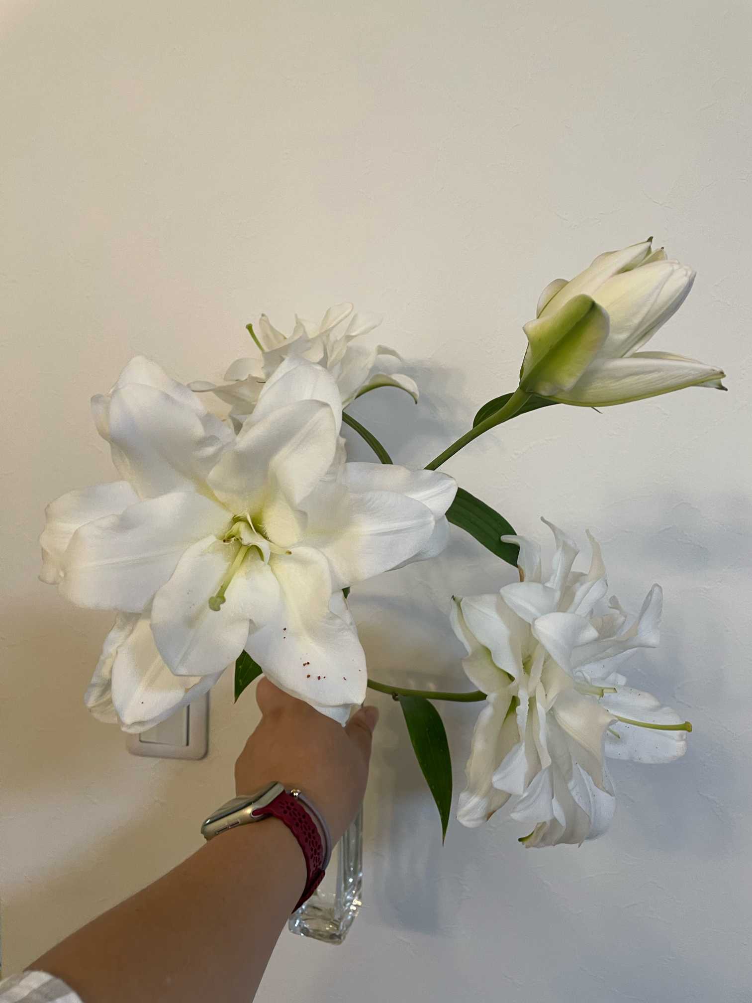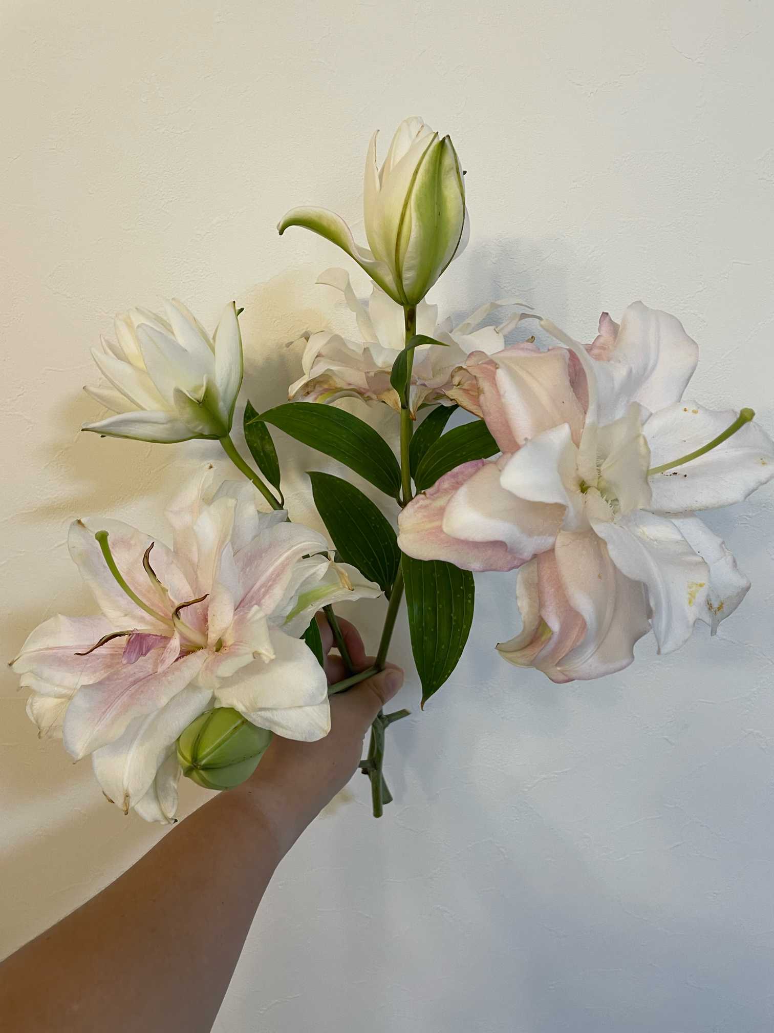 百合っていくつも咲いている枝ごと切りるイメージだけど、花茎からで大丈夫かしら?試しに水に刺してみよう。雄蕊は服につくと採れなくなるので切りました。