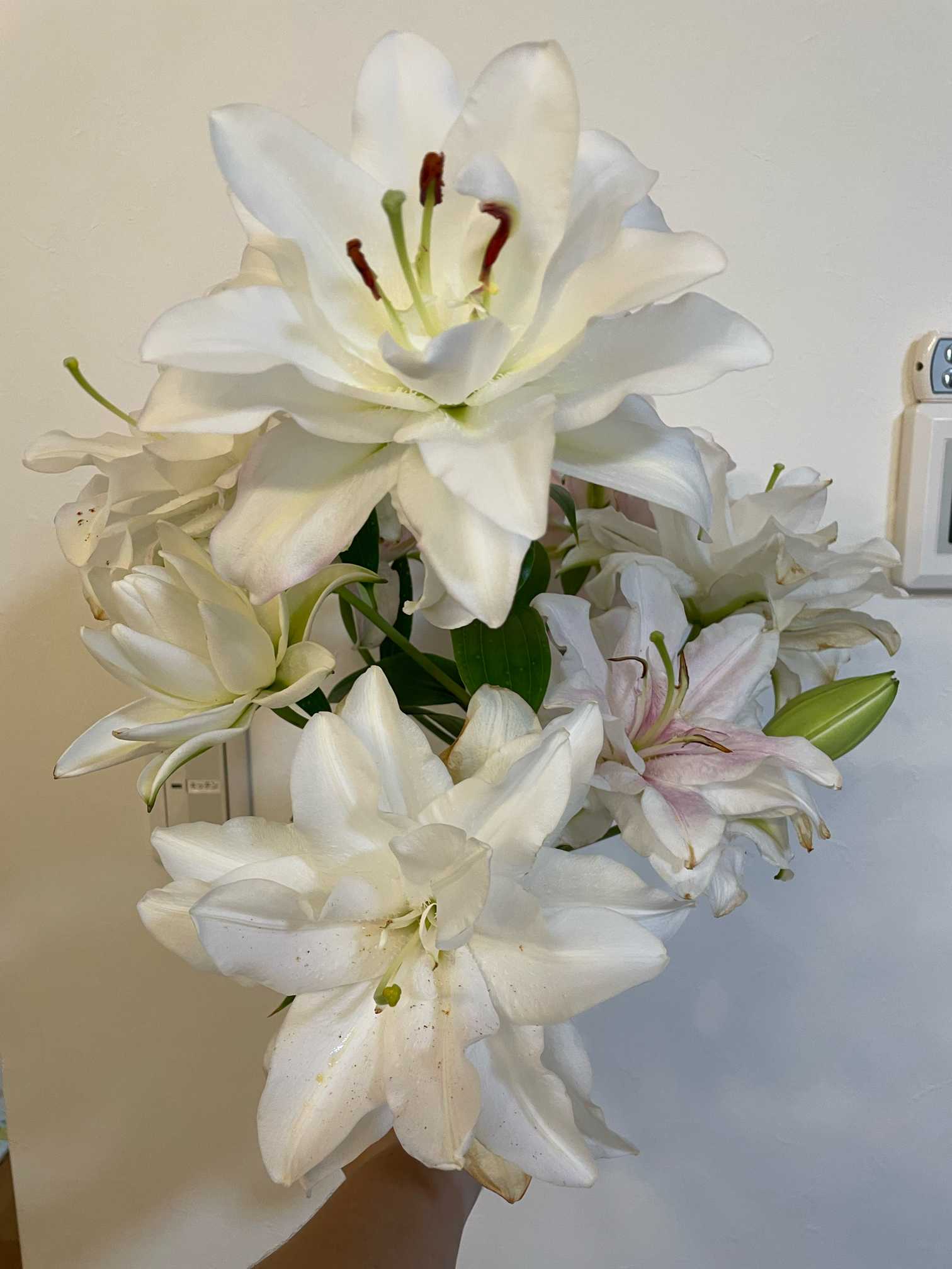 たくさん雨が降るというので、せっかく咲いた花がダメになるかもと一本切って花瓶に挿しました。部屋中百合の香り