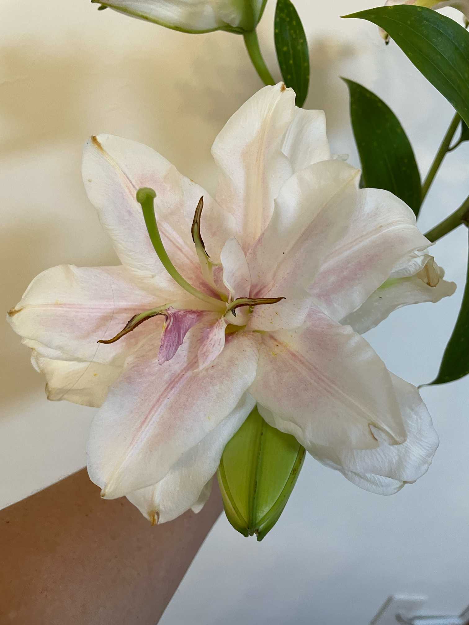 球根を植えてから、ピンクっぽい色味の花を期待していたのにずっと真っ白の花が咲いていました。なんと!今年は少しピンクがかった花が咲いています!