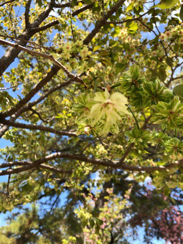 新芽(葉)が赤みがかっている中にこの黄緑の花が塊で咲く様は本当に目を奪われる。