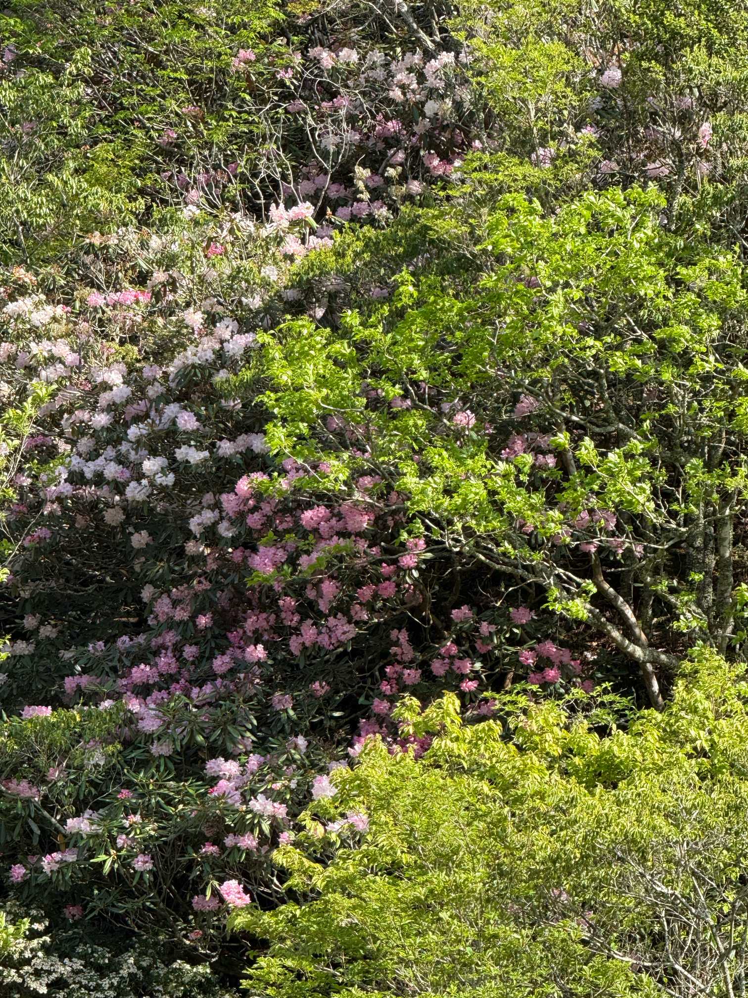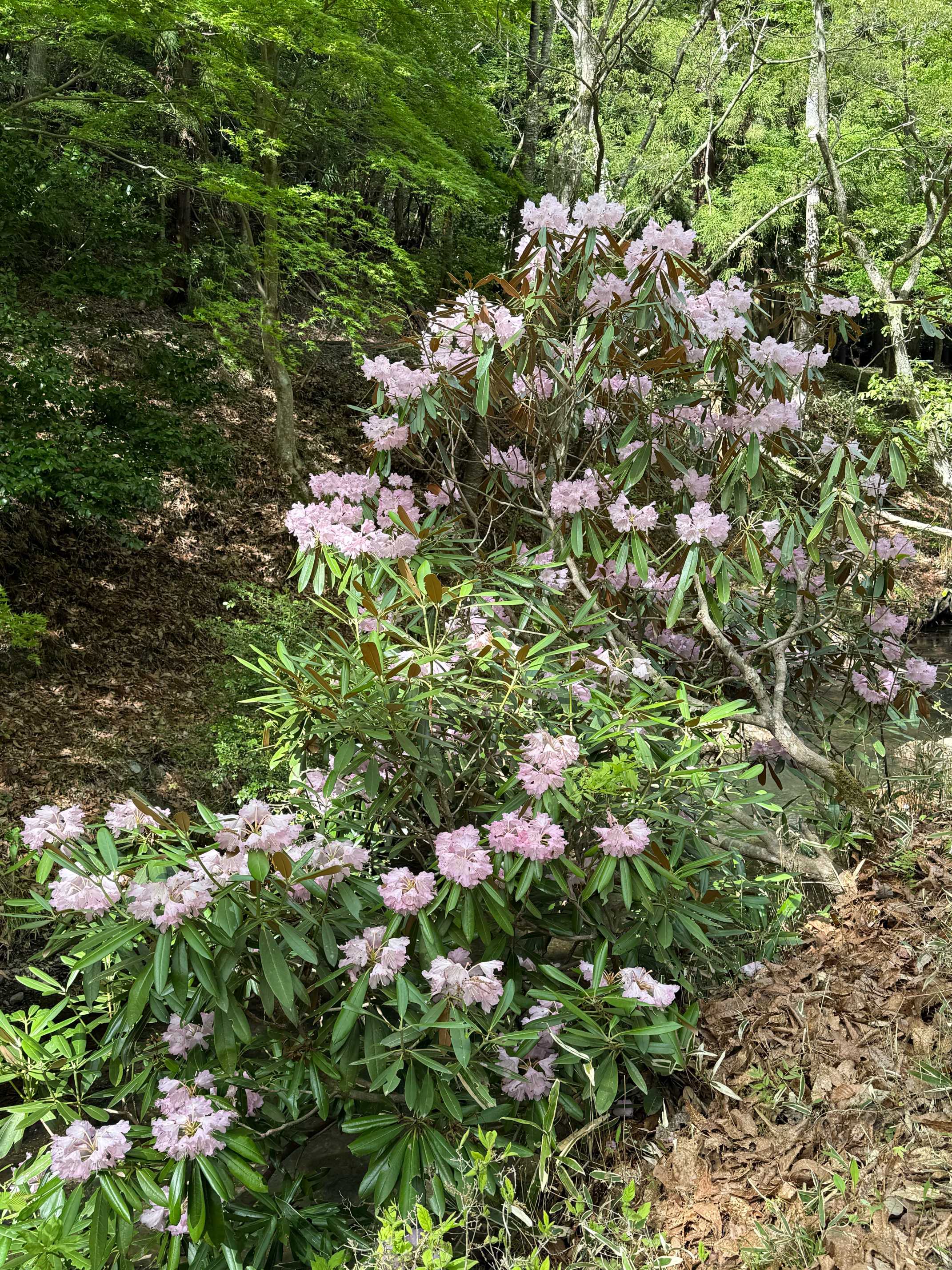 川の対岸、山の斜面に沢山のホンシャクナゲが見られます