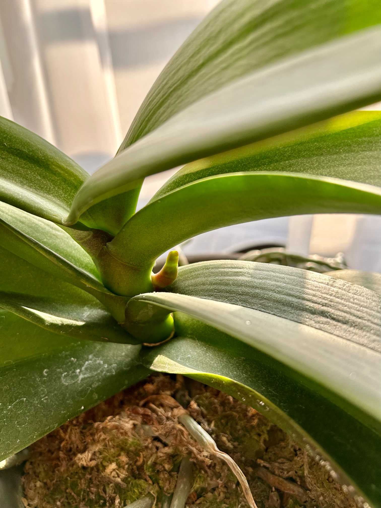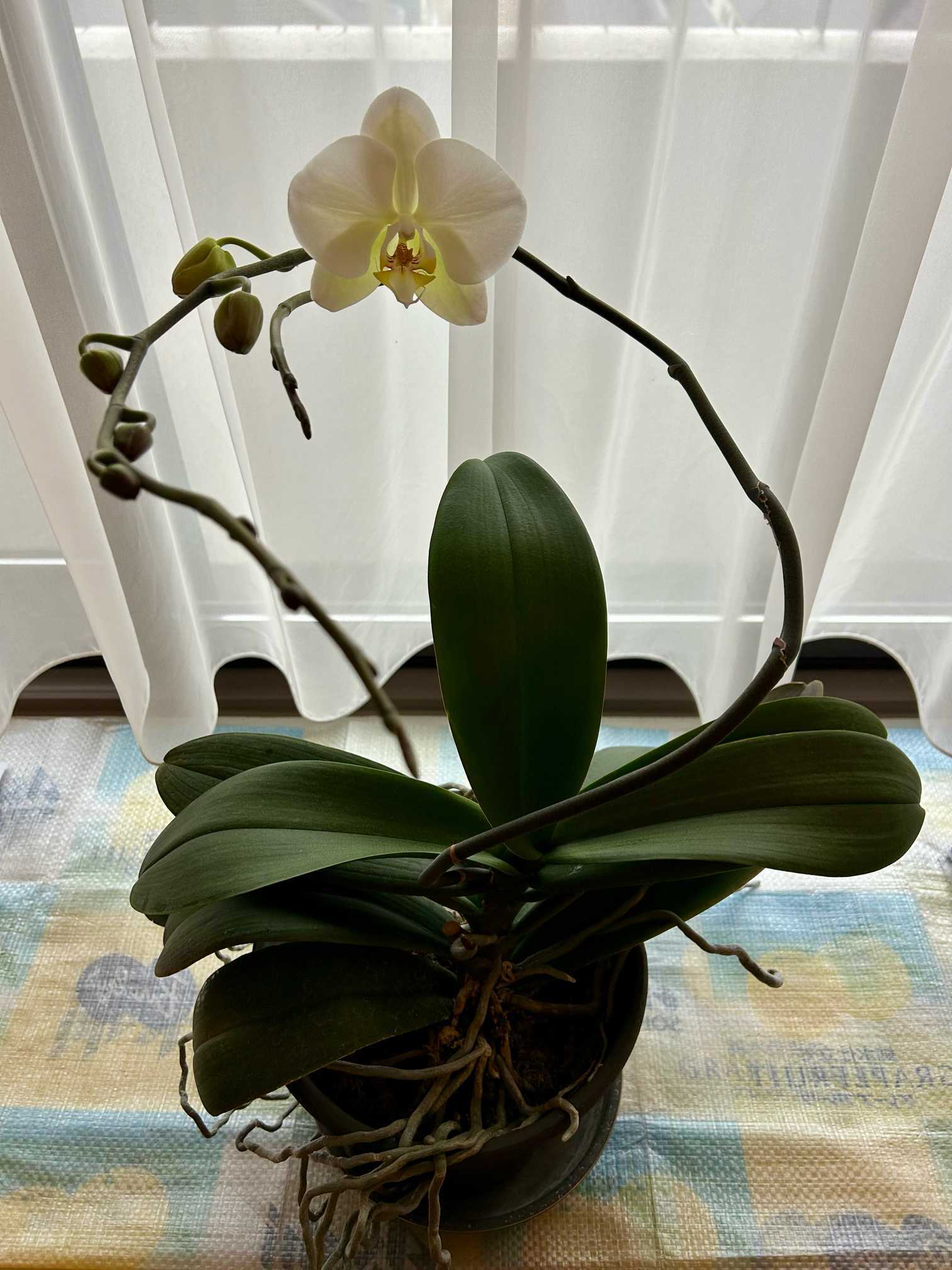 オフィシャルシーンの胡蝶蘭は自宅で育つのか⁉️軽い気持ちで挑戦したのは妹です。3年たって、安定した1株を持ってきてくれました。既に花茎が2本伸びた状態で譲り受けたけど、高級ランは初めてなのでドキドキ💦