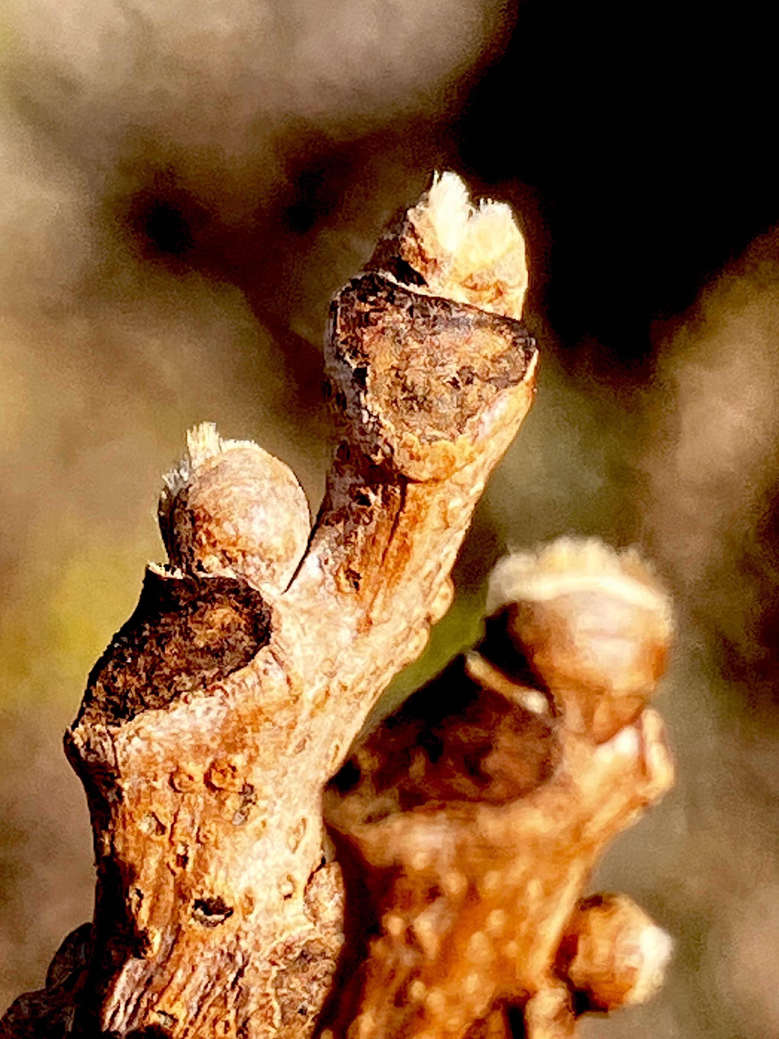 ・冬芽は裸芽で縮れた毛が密性!芽吹くはずの冬芽の下に予備芽があって、中々の用心深さです(保険の役割)