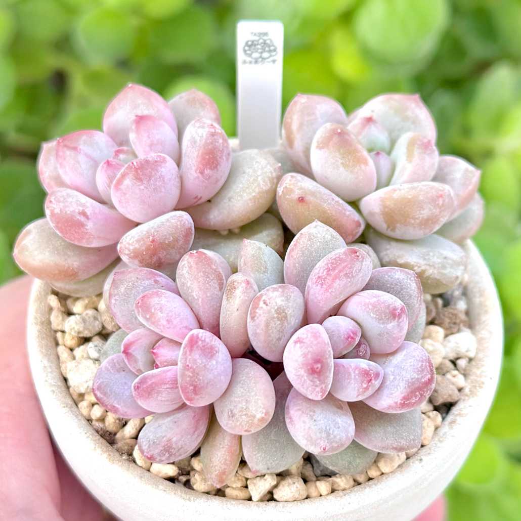 【エケベリア組 ㊗️新入生】 ●ピンクジェニー(蜜桃雪珊/蜜桃雪) 6cm鉢 『ピンクジェニーの名だったが… ジェニー系はツヤツヤの丸葉が多く粉系は怪しい。 中国苗の蜜桃雪珊か検証中。』