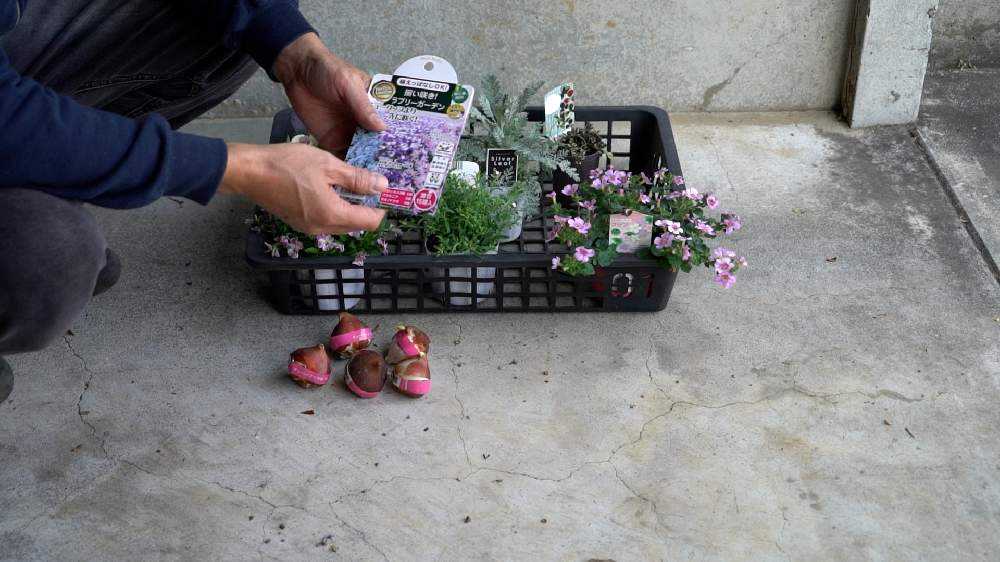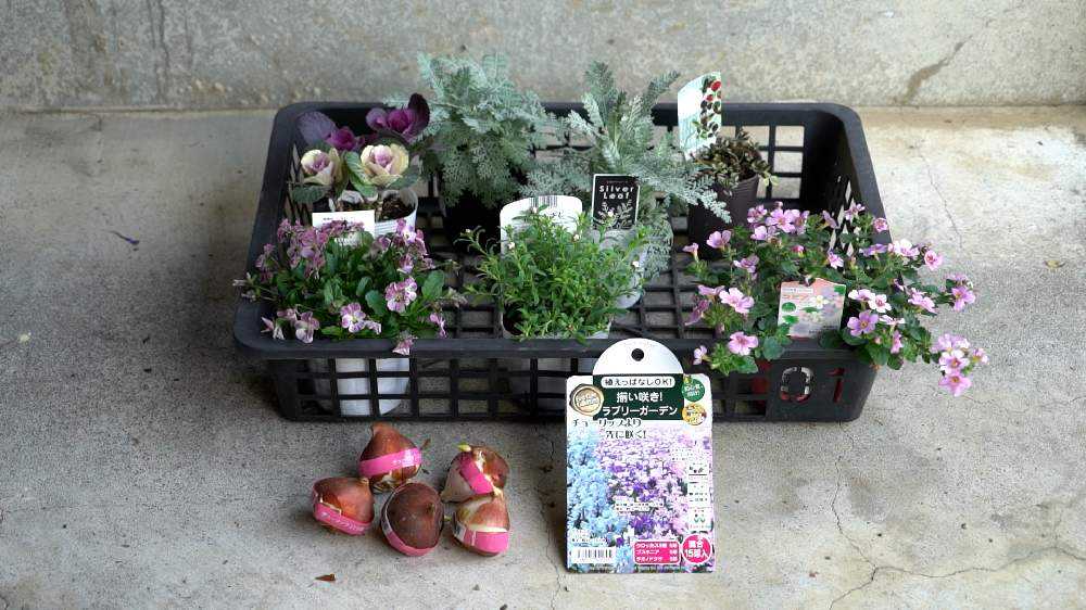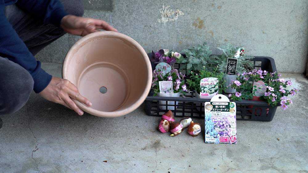 用意した苗と球根です。ダブルデッカー(トリプルデッカー)植えというのは、寄せ植えの下に球根を忍ばせておいて、春になったら地上部の苗の間から球根植物が芽を出して姿の変化を楽しむものです。今回選んだ球根は植え付ける深さが違うので、トリプルデッカー(3階建て)にしました。初めてということもあって、ちょっと球根を入れすぎてしまったかもしれません。春になったらどうなることやら・・・。