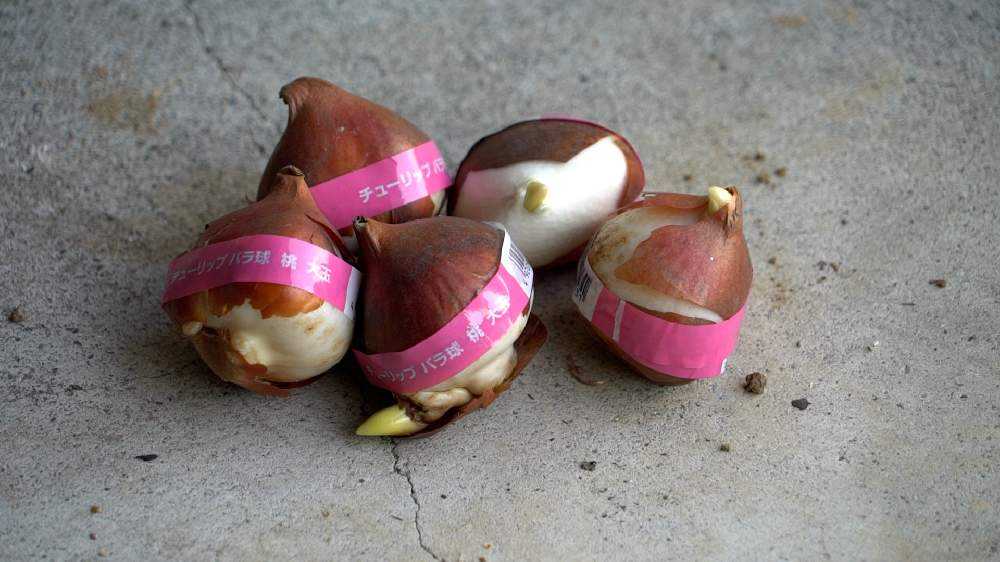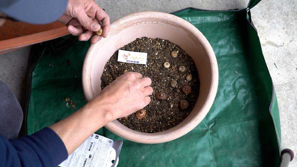 チューリップの球根は奥側に配置してみました。ちなみに球根の方向をそろえると葉が同じ方向に延びます。球根の平たい扁平な方を手前に向けて置いています。