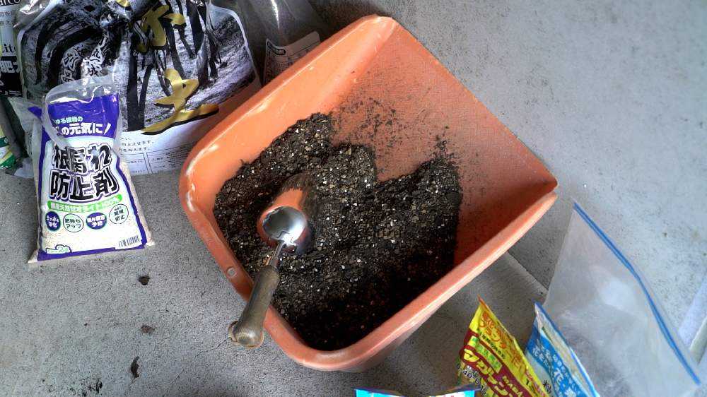 培養土の配合をしています。寄せ植え用の培養土ですが、今年は、赤玉土小粒6、腐葉土3、バーク堆肥1を基本に、もみ殻くん炭を軽く1(パーライトを軽く1追加で入れる場合もあります)、珪酸塩白土大きく一握り、苦土石灰一つまみ(3g程度)、マグァンプK中粒適量、オルトランDX適量で配合しています。秋にこの配合でテストしてとても調子が良いです。