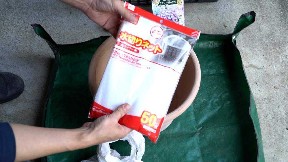 いつもは紫外線や水に強い果実用のネットに鉢底石をいれるのですが、今回は100均の水切りネットを使ってみました。ネットに鉢底石を入れておくと、植え替えたりする時にとても便利です。ネットごとジャブジャブ洗って干しておけば、再利用しやすいです。今まで使っていた果実用のネットと違い、ちょっと弱そうですが、50枚入って100円なので、都度使い捨てした方が良いかもしれません。