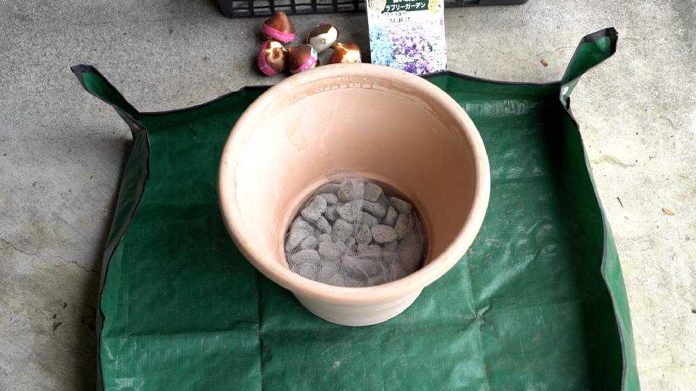 鉢底網を敷きます。さて、植え付け作業の開始です♪