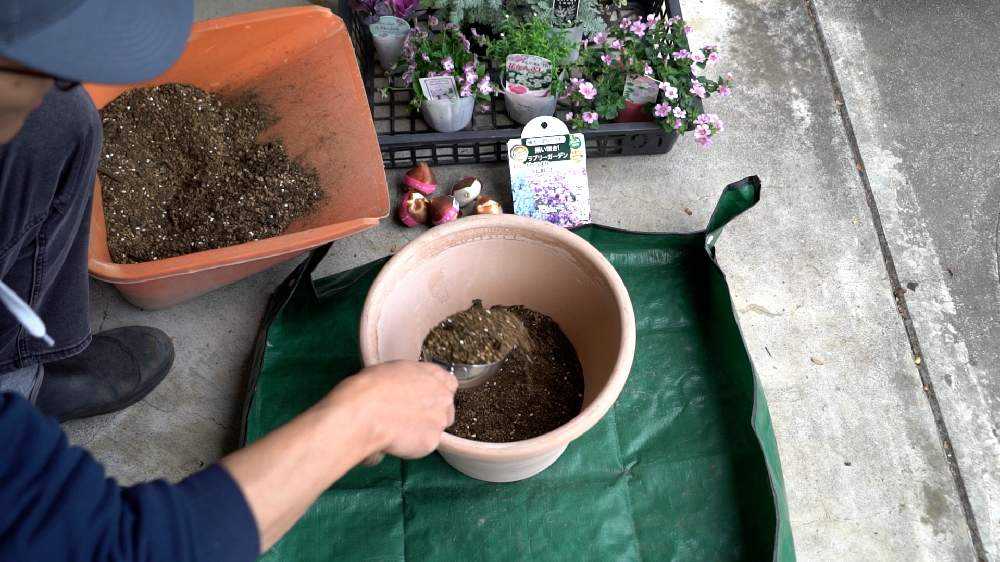 小さな2階の球根に培養土を被せ、次に植え付ける苗の根鉢の高さまで土を被せます。