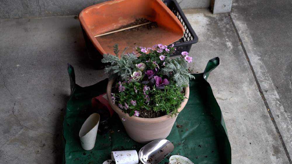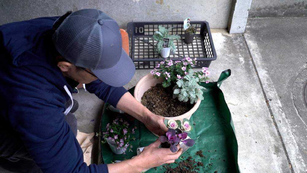 寄せ植え苗のミニ葉ボタン ミニデュエット&ミニファミリーを株分けします。本当は4つに株分けしたかったのですが、品種ごとに地下で繋がっていたので、2つに株分けした所でやめておきました。