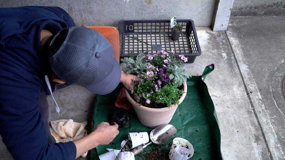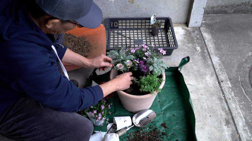 メインのビオレッタ・ラズベリーアイスを配置します。ヴィオラやパンジーは根張り沢山させると開花数が増すので、他の苗よりも周りにゆとりを持たせて土が沢山入るようにしています。