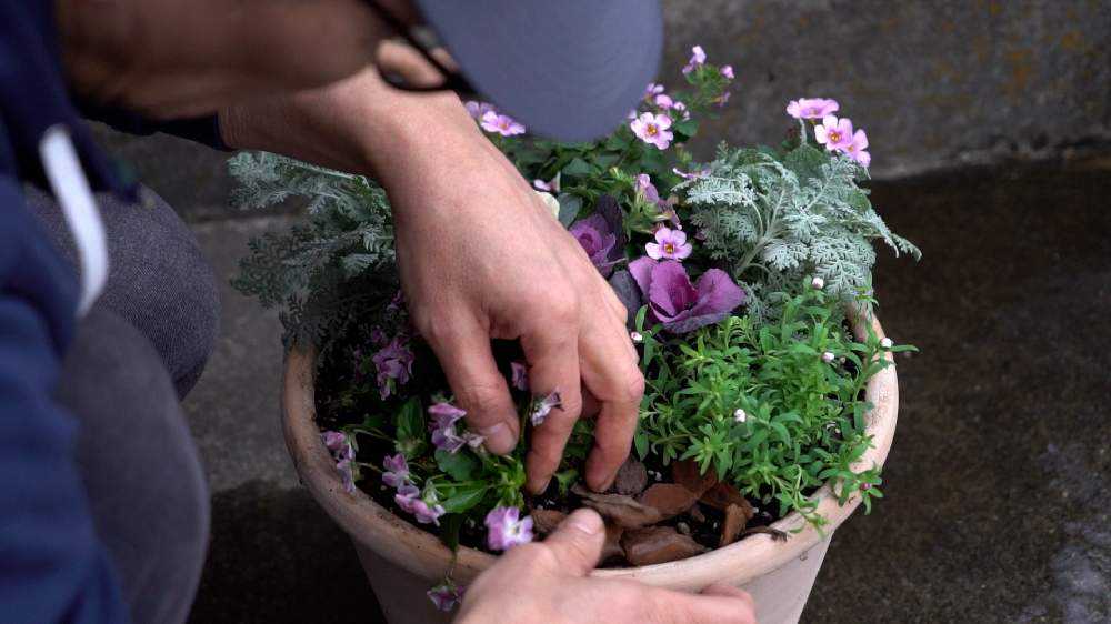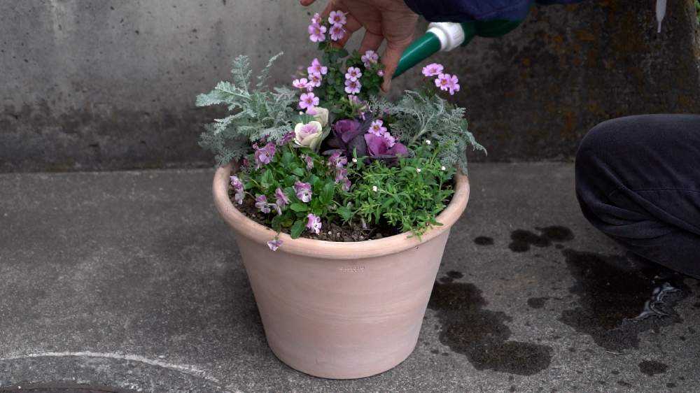 最初はバコパ コピア シングルピンクから植え付けます。バコパは寄せ植えなどでは、前景に用いることが多いのですが、今回はヴィオラが主役なので、修景の意味合いとして奥側に配置します。この位置にバコパを置きました。
