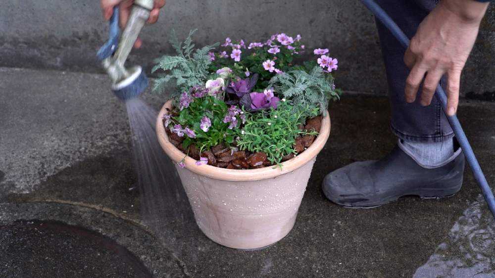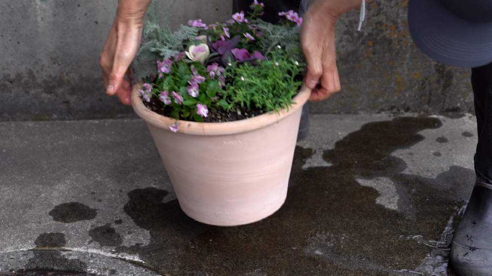 最後にテラコッタに付いた培養土などをシャワーで綺麗にします。