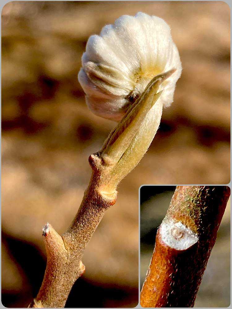 冬芽は予備芽を伴い柔らかい毛が密生!