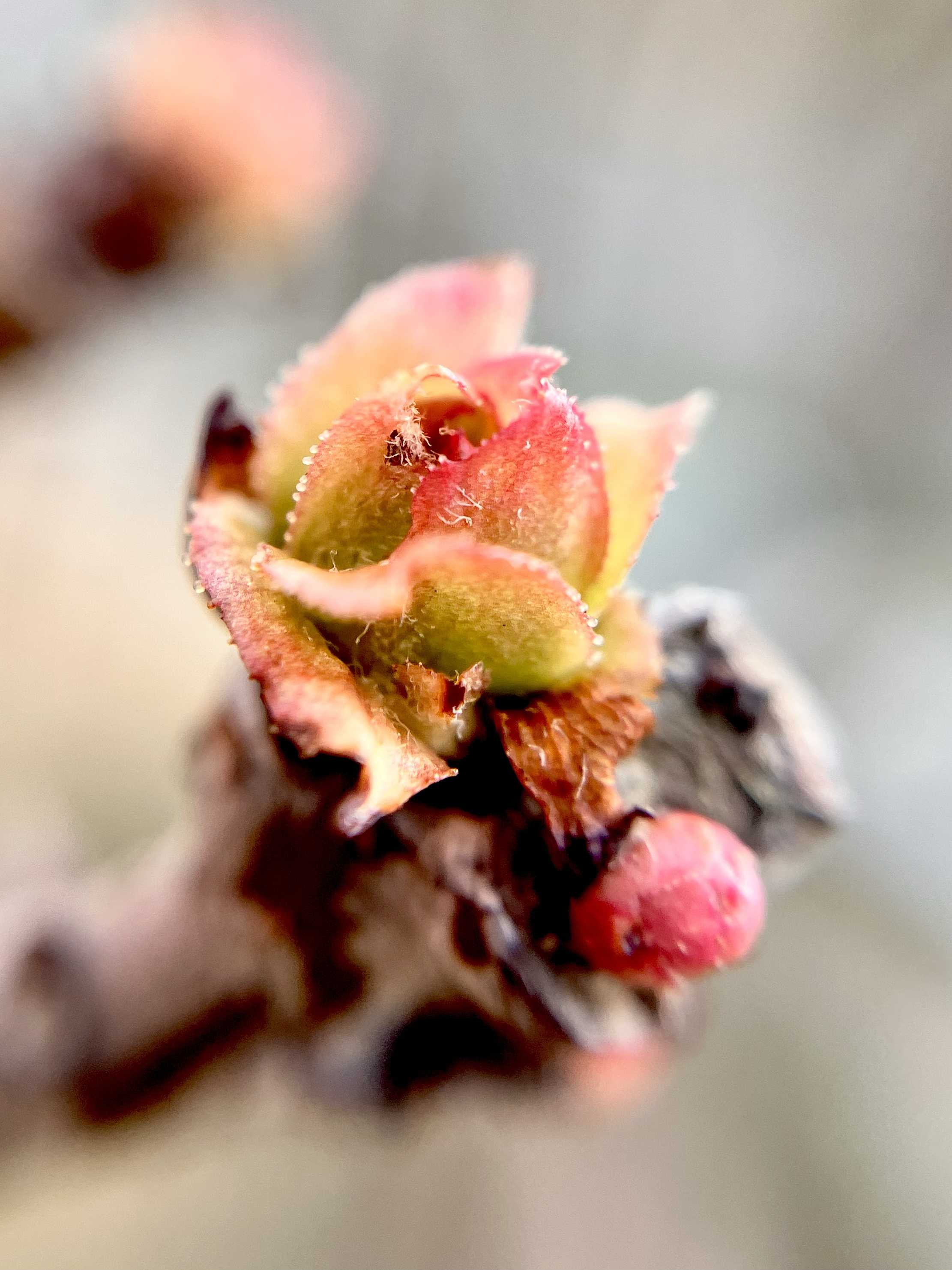 艶やかな赤い冬芽の芽鱗から柔らかい新芽が飛び出して来ました❣️