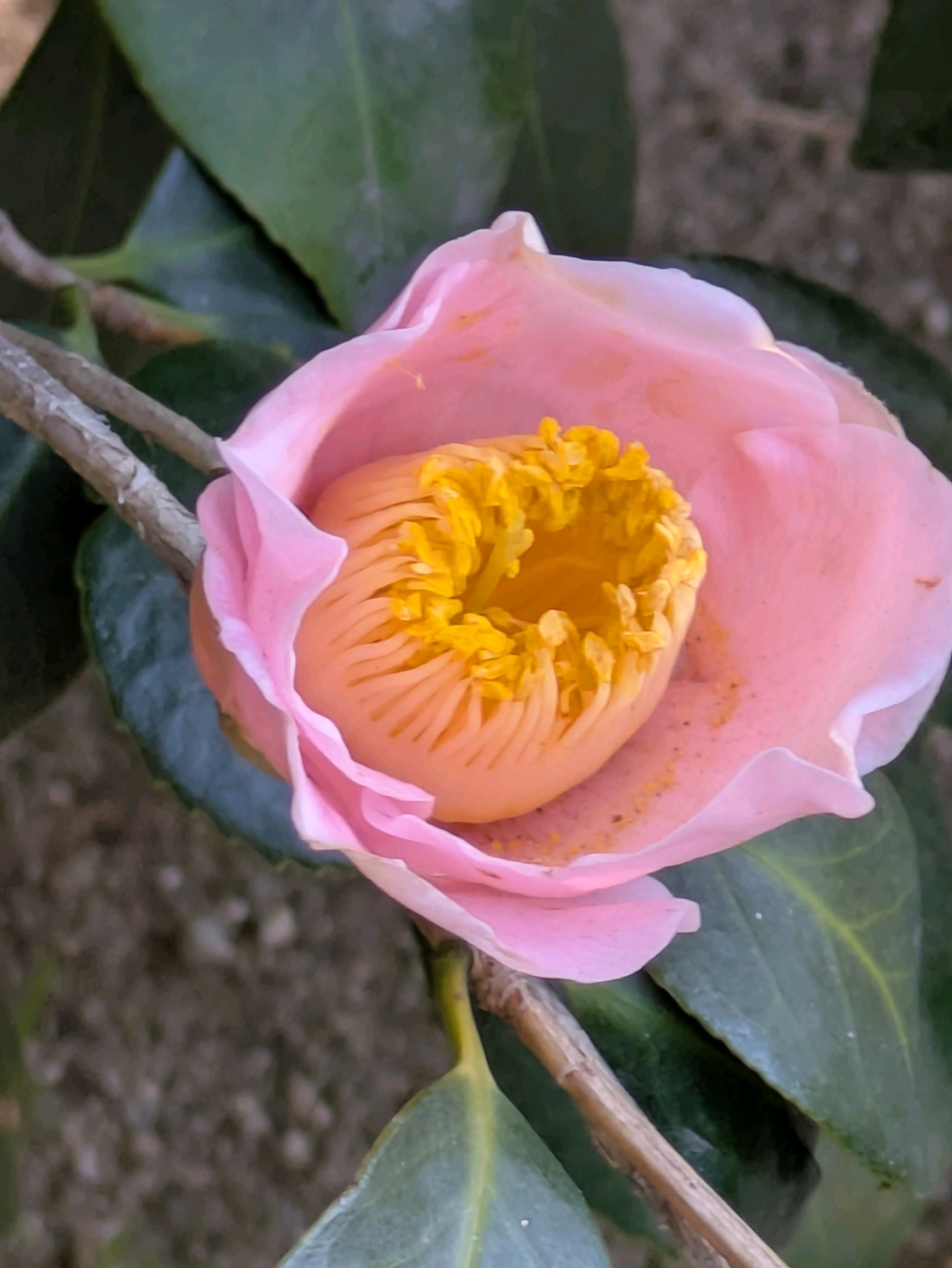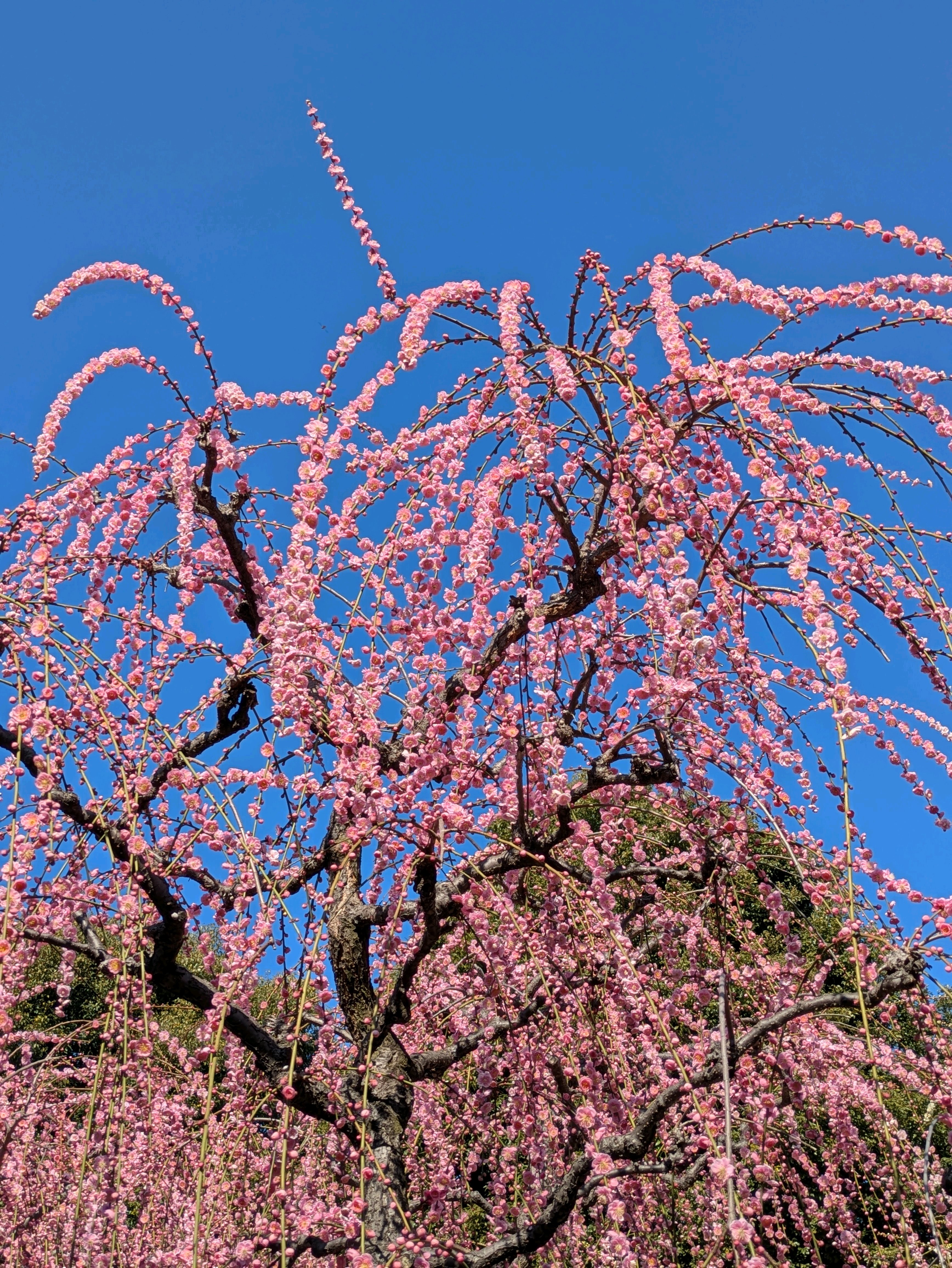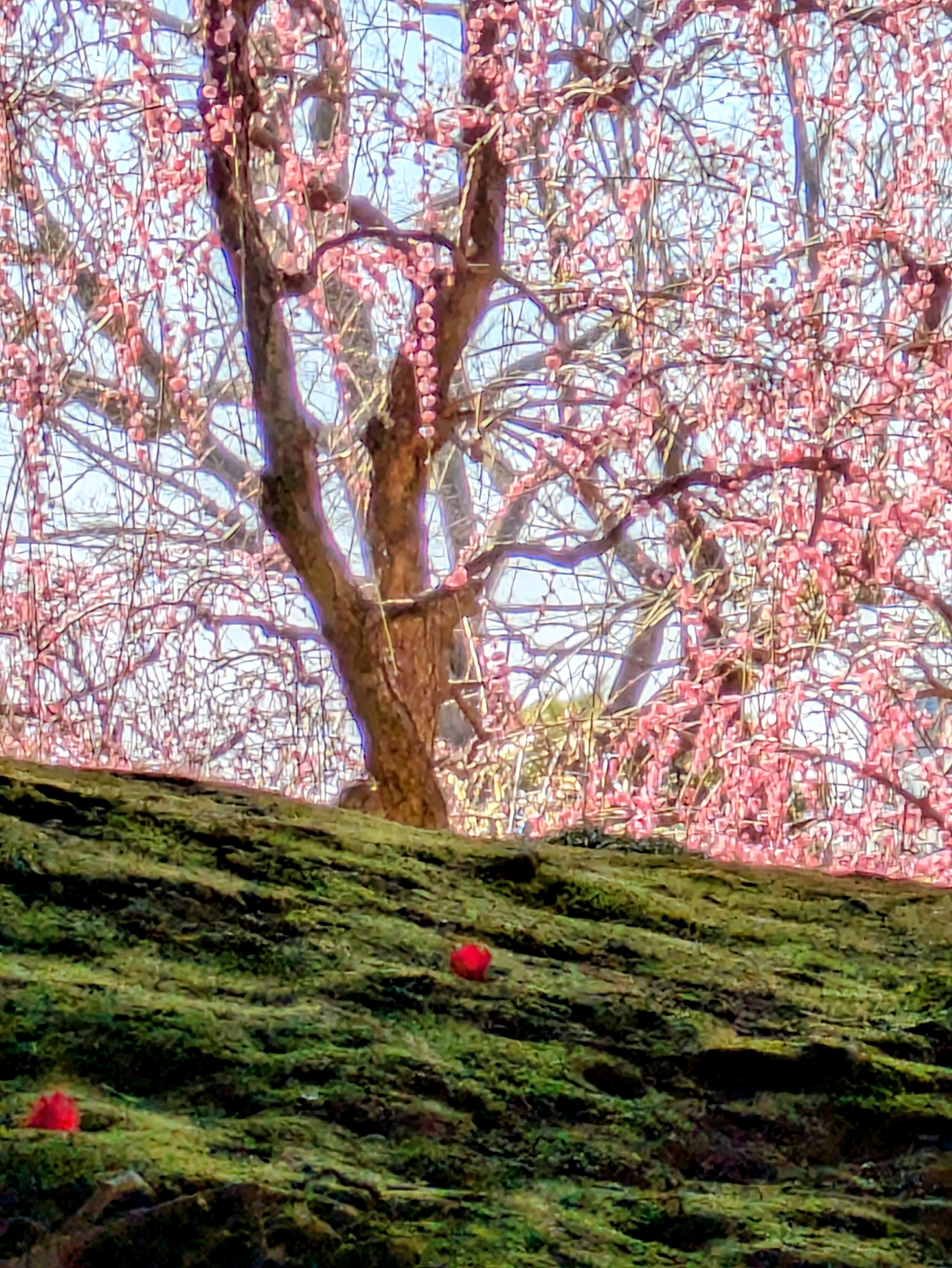 有名な落ち椿と枝垂れ梅の場所ですが、まだ落ち椿は少ないです