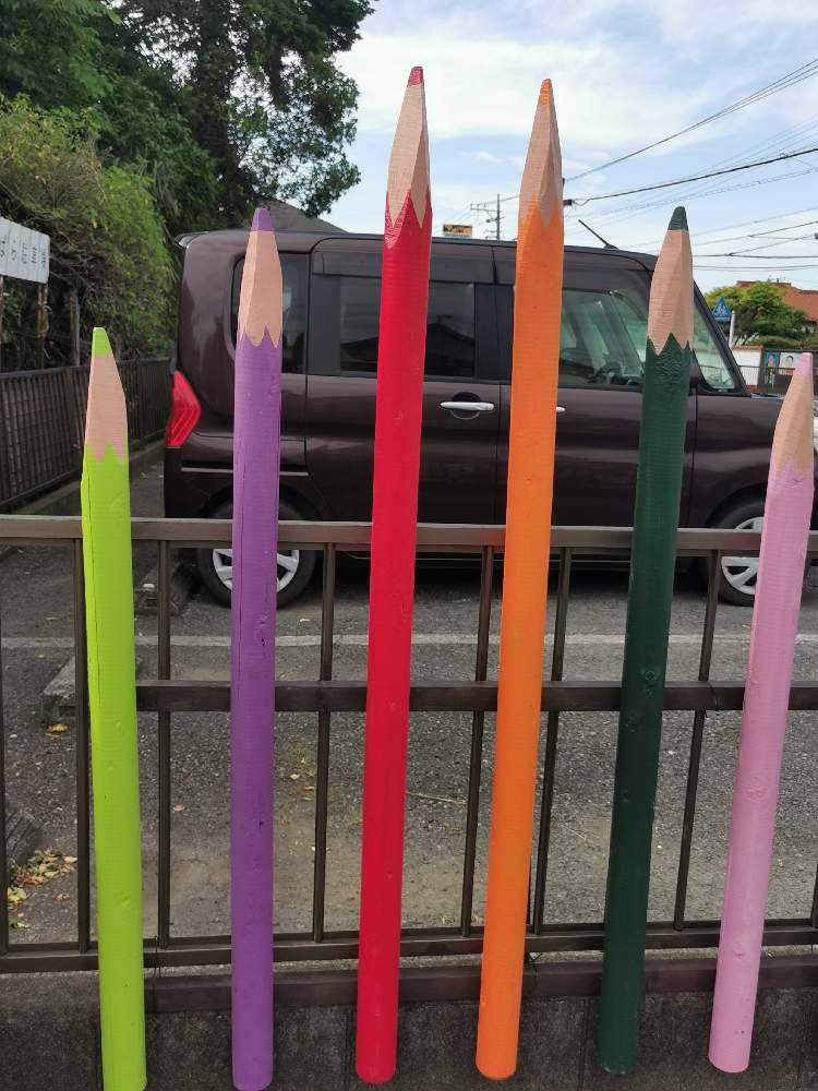 この色鉛筆に見えるディスプレイは、杭をペンキで塗ったそうです。向こう側は、駐車場です。