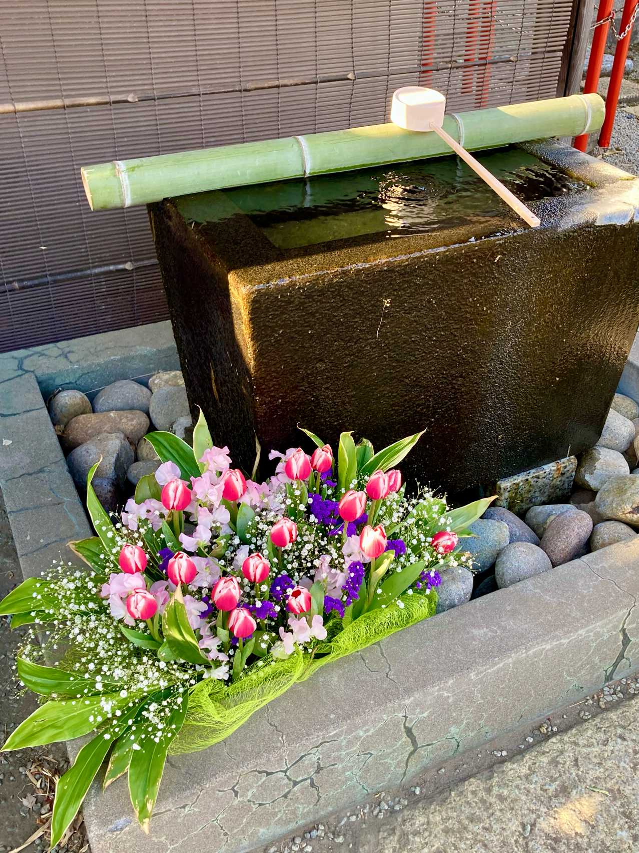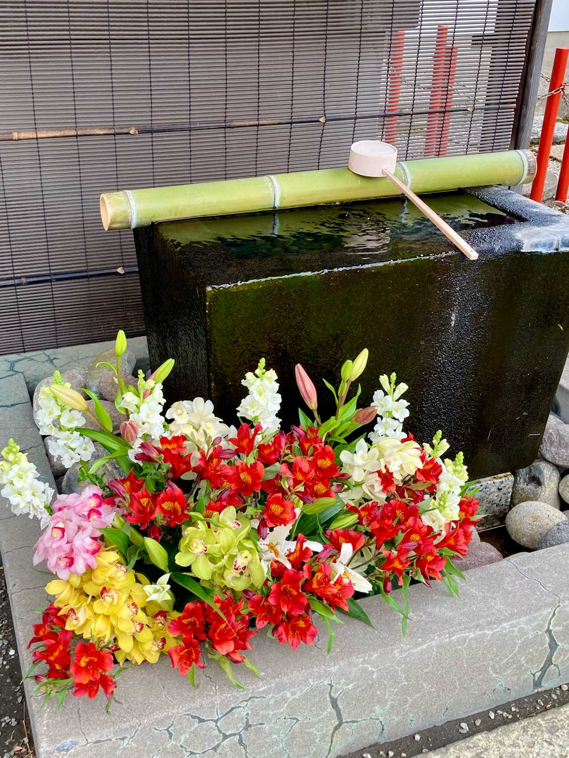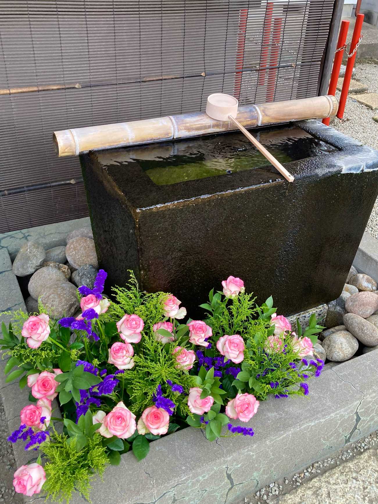 手水舎をアレンジメントフラワーで華やかに彩っていることを最近知りました^_^