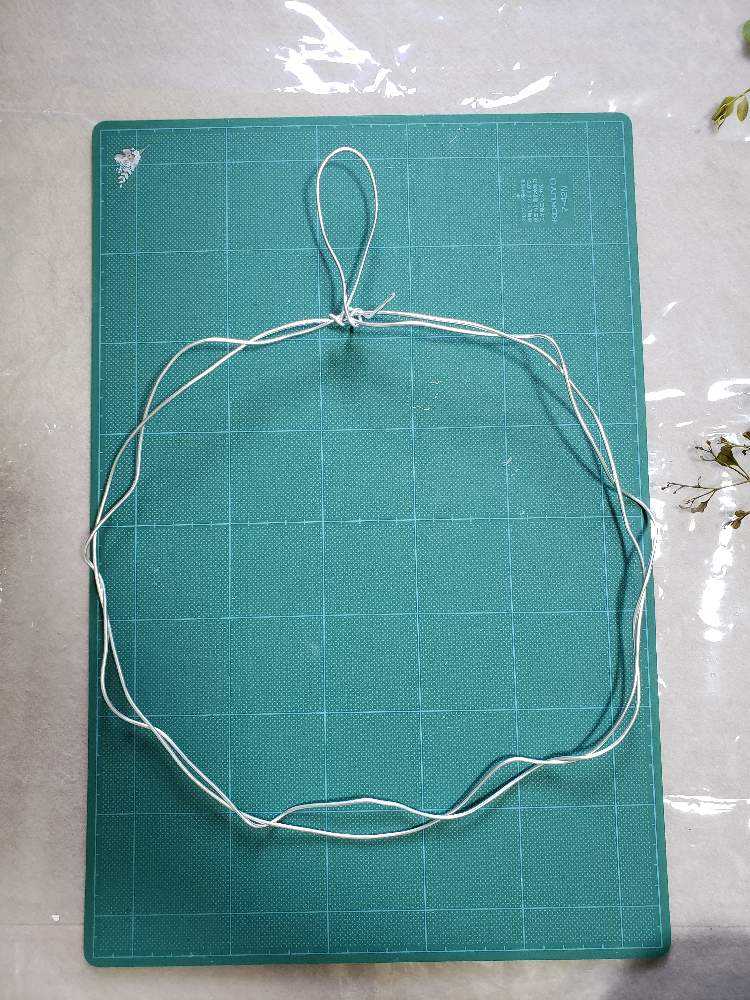 25~30センチくらいの枝をワイヤーに沿わせ、3ヶ所くらい長さ1/4位にしたフラワーワイヤーで留めます。