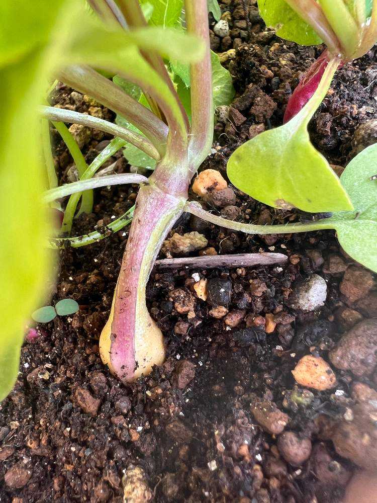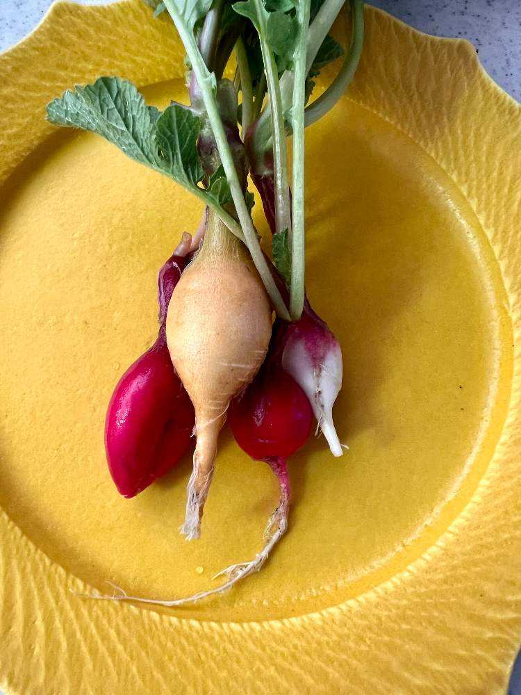 ラディッシュは大きくならないから数個収穫します。もしやツルボケ❣️葉っぱが立派なラディッシュ からし菜は順調ですね