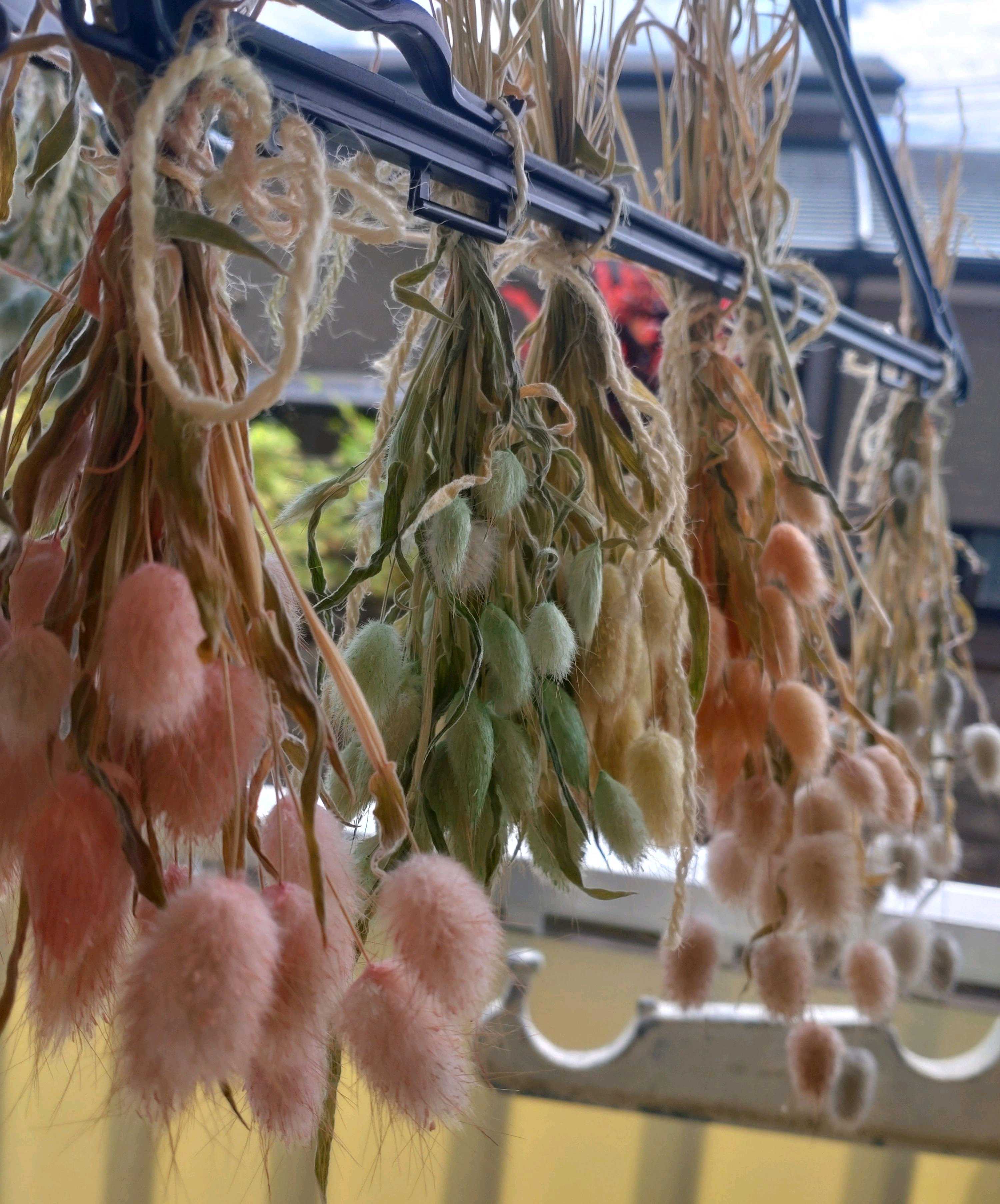 2時間ほど放って麻紐で結び、ハンガーに吊るしました。
