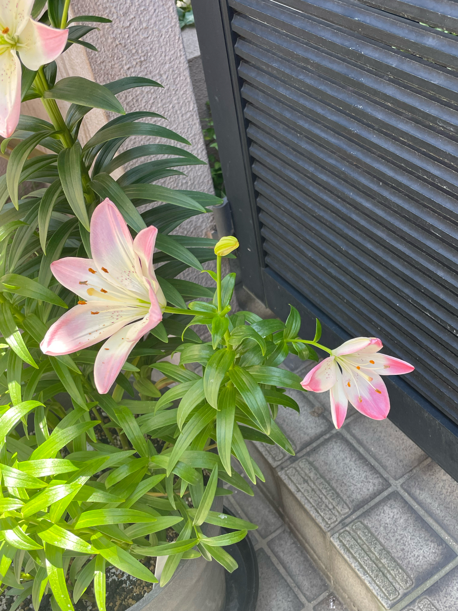 大雨☔️で車庫の後ろに避難中、気づいたら 3つ咲いてましたーっ‼️