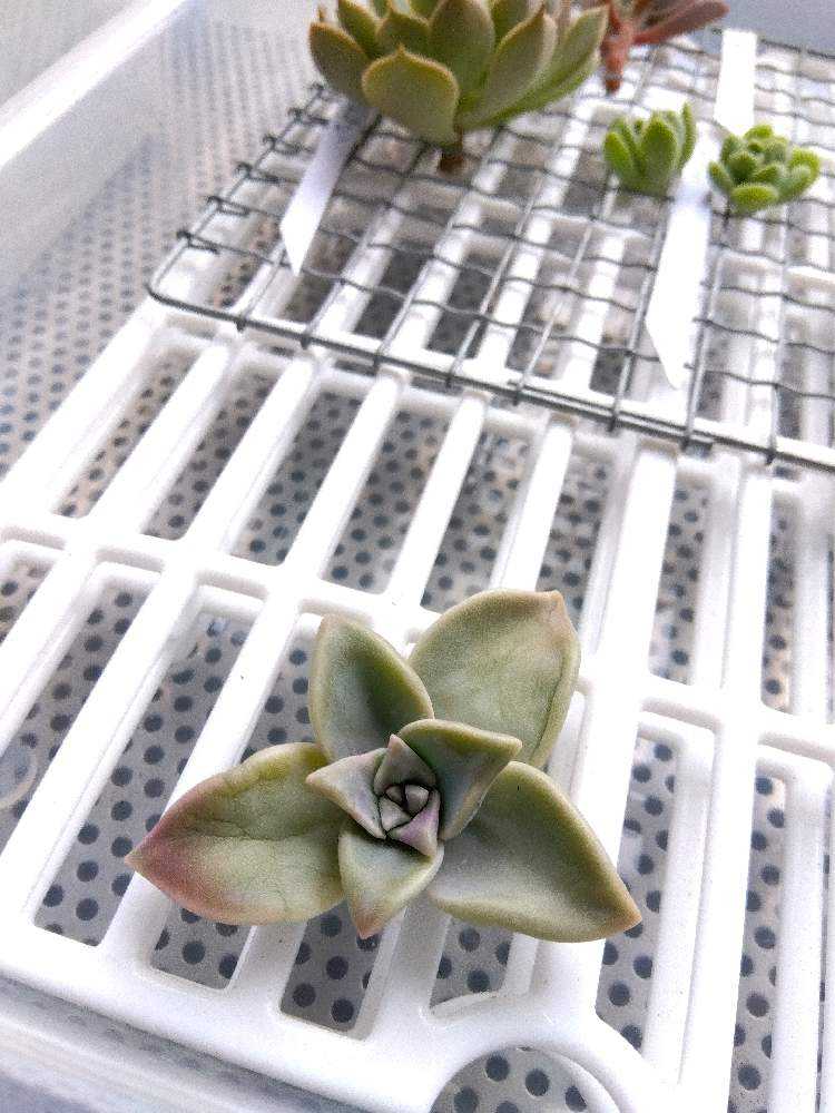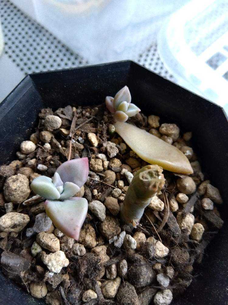 小さい株の葉っぱは朧月らしいくすみカラー。左は別管理してた葉挿しを戻したもの