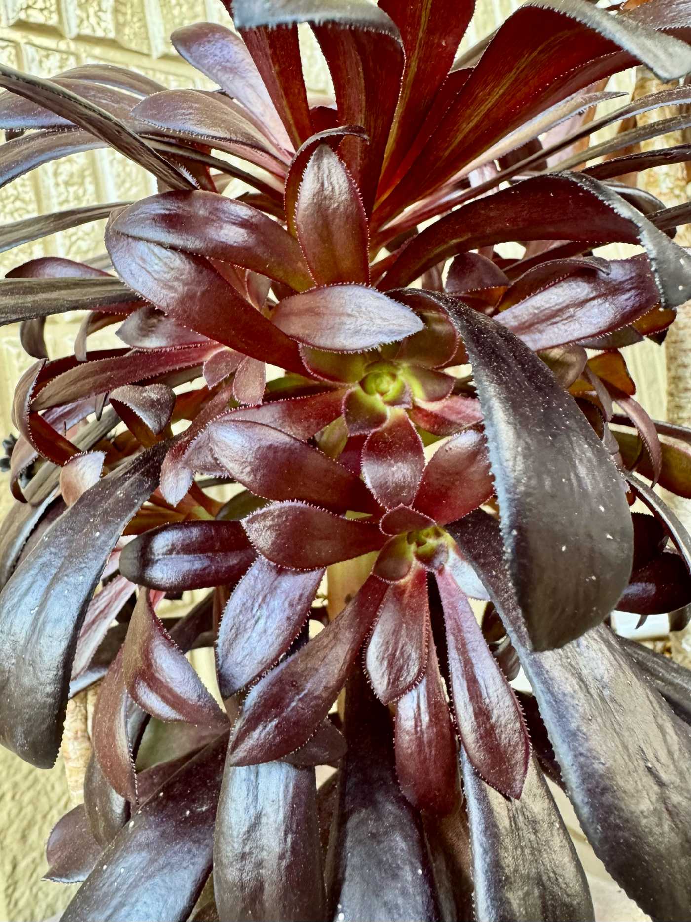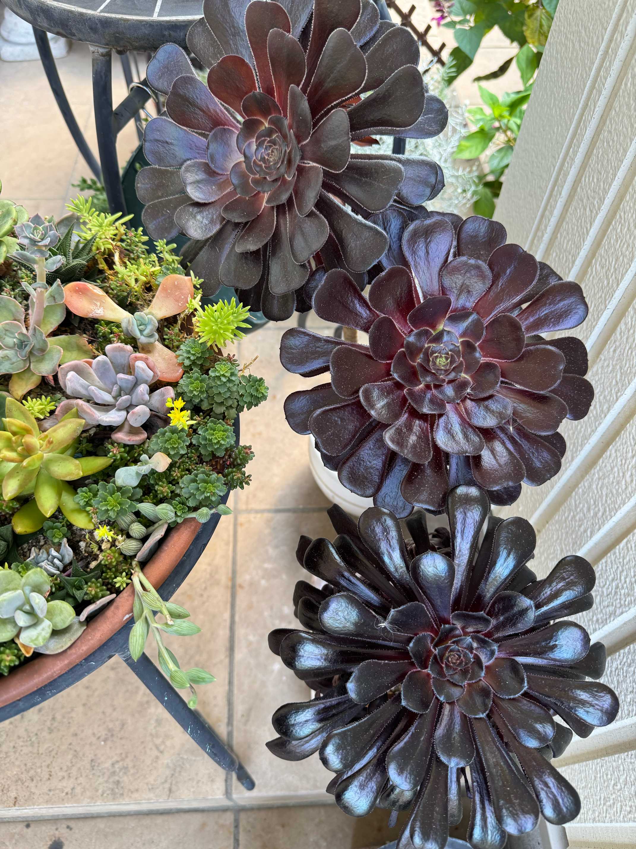 2025.6.18 直射日光避けて軒下避難の黒法師🖤つやつやです ちびすけはもうすっかり大きくなり子株もたくさんついています