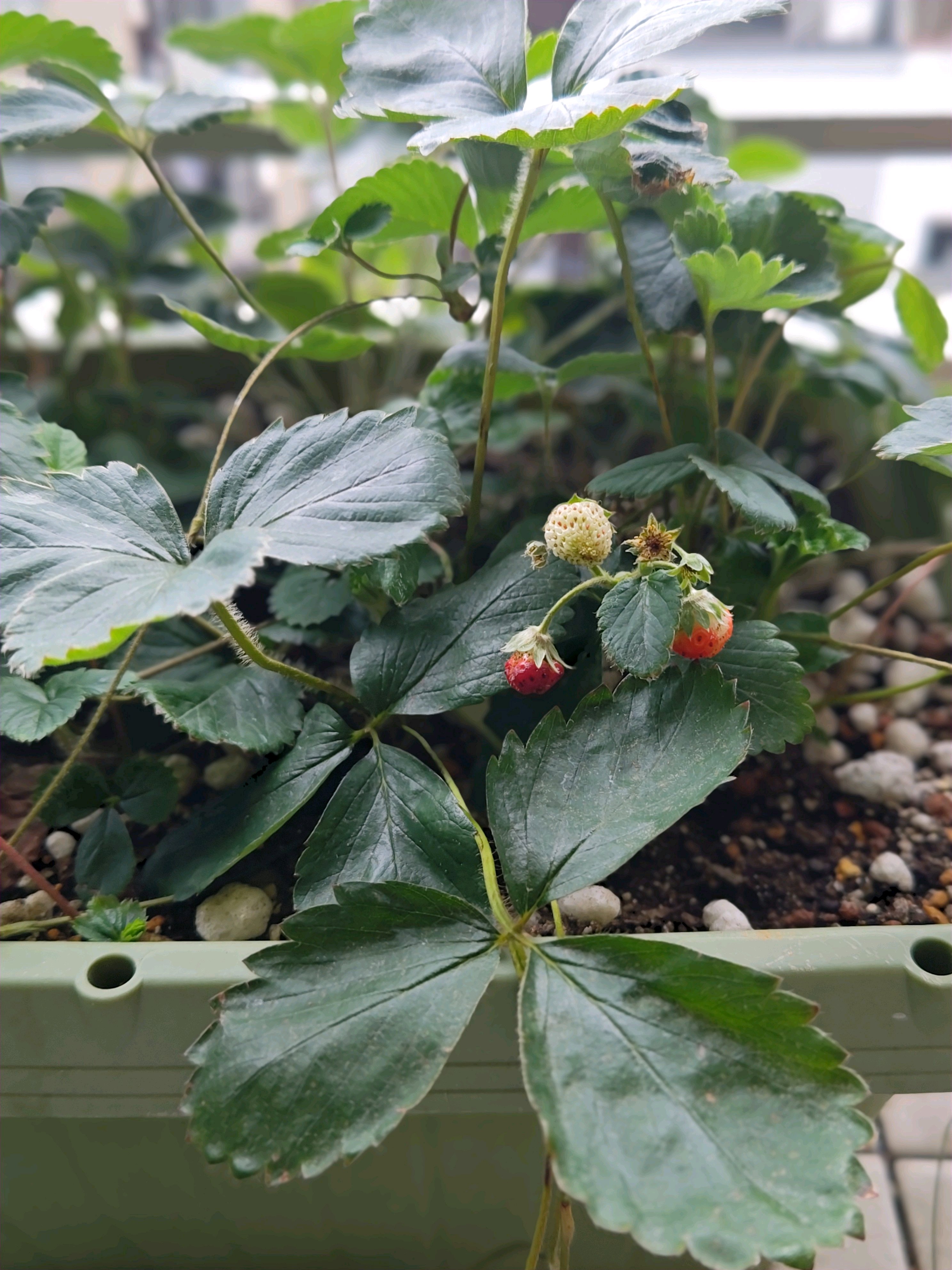 2022年の初めに吊り鉢に植えて、何度もランナー取って増やして•••。親株にできる実🍓が小さいのも納得。
