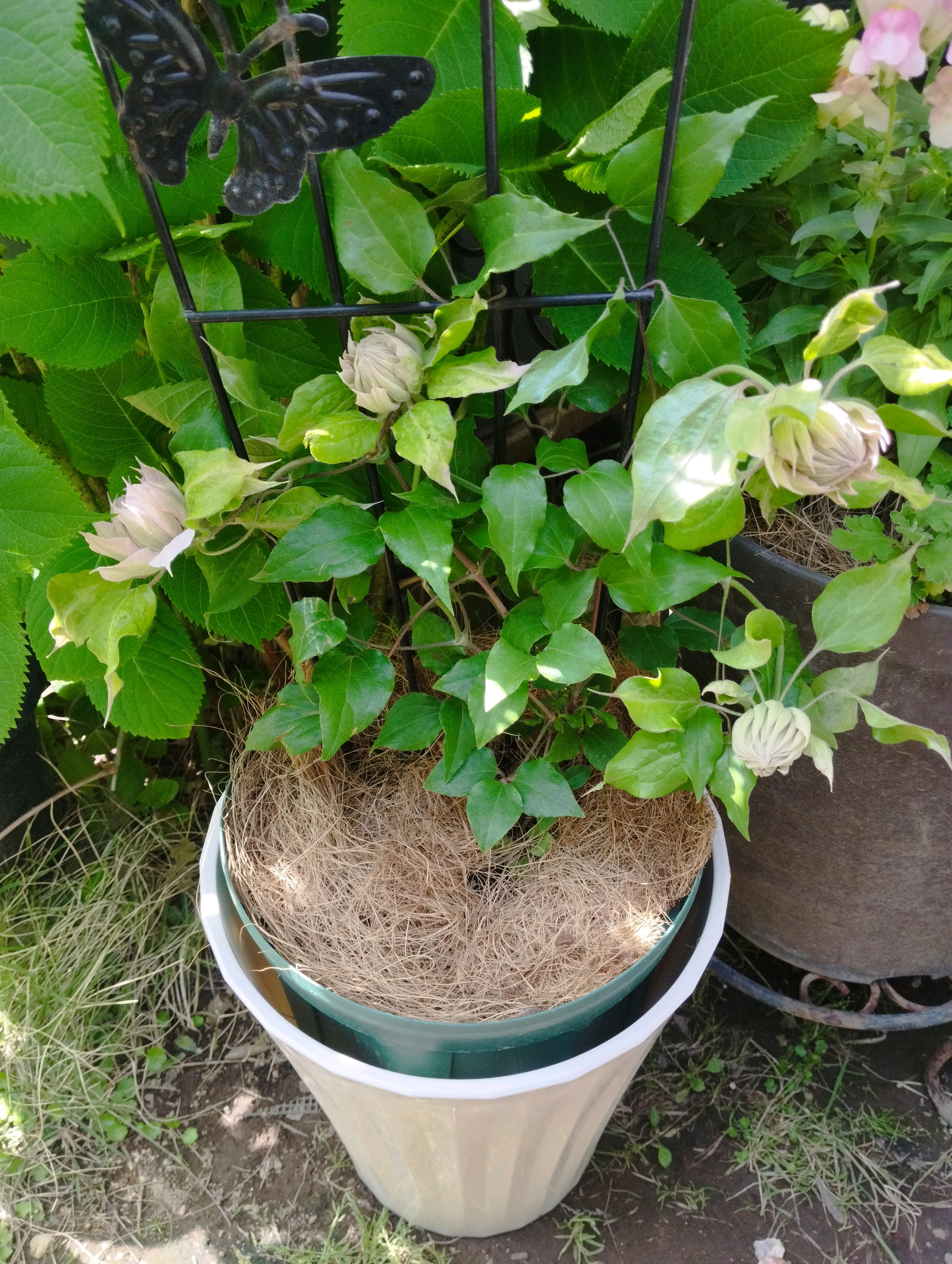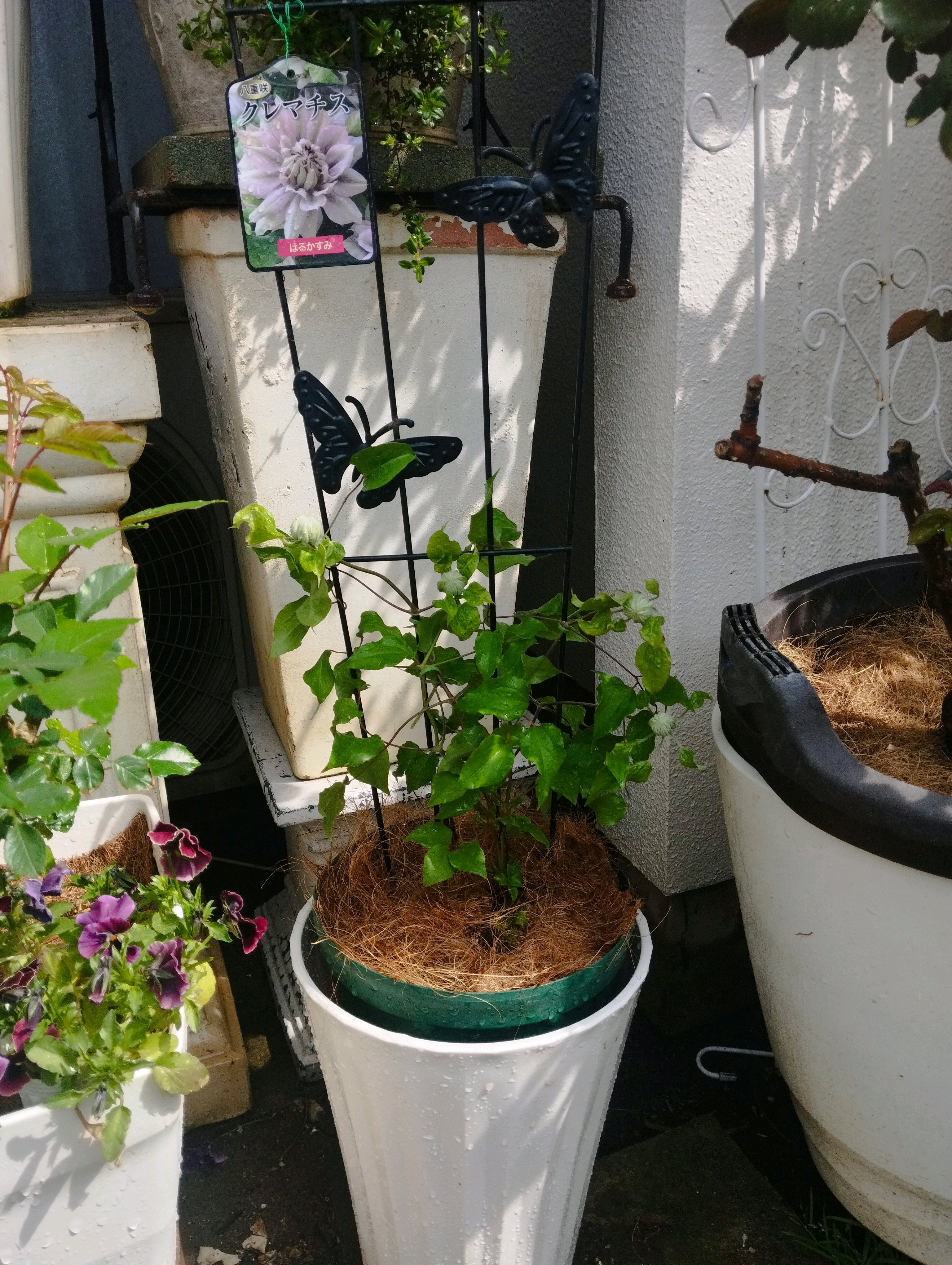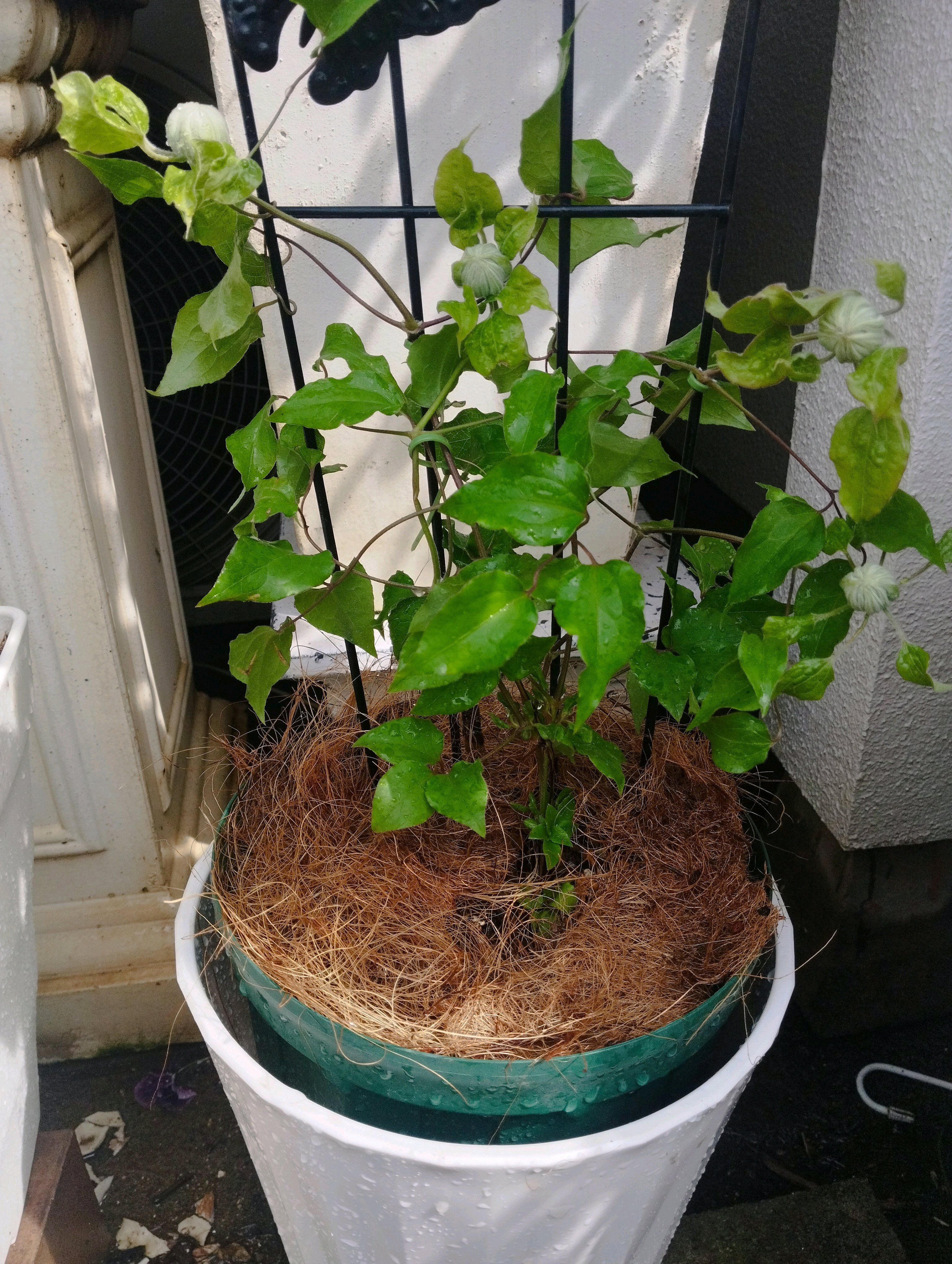 8号鉢のスリット鉢に鉢増ししてからトレリスに絡ませて白い鉢にポットインしました