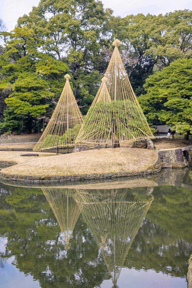 池の水鏡に映る姿が、また美しい。冬の寒さや雪から樹木を守る先人の知恵が詰まってますね。見せていただいて、ありがとうございます🤗💕
